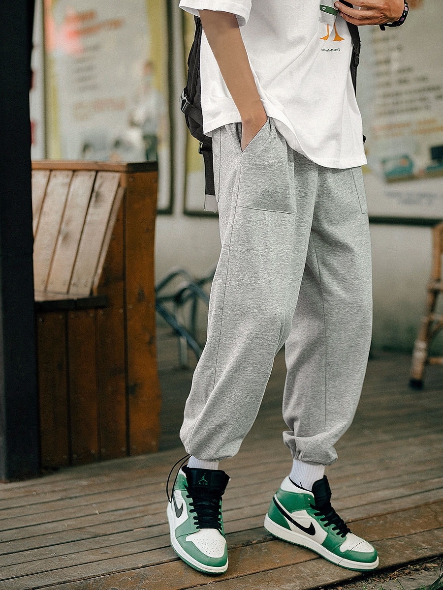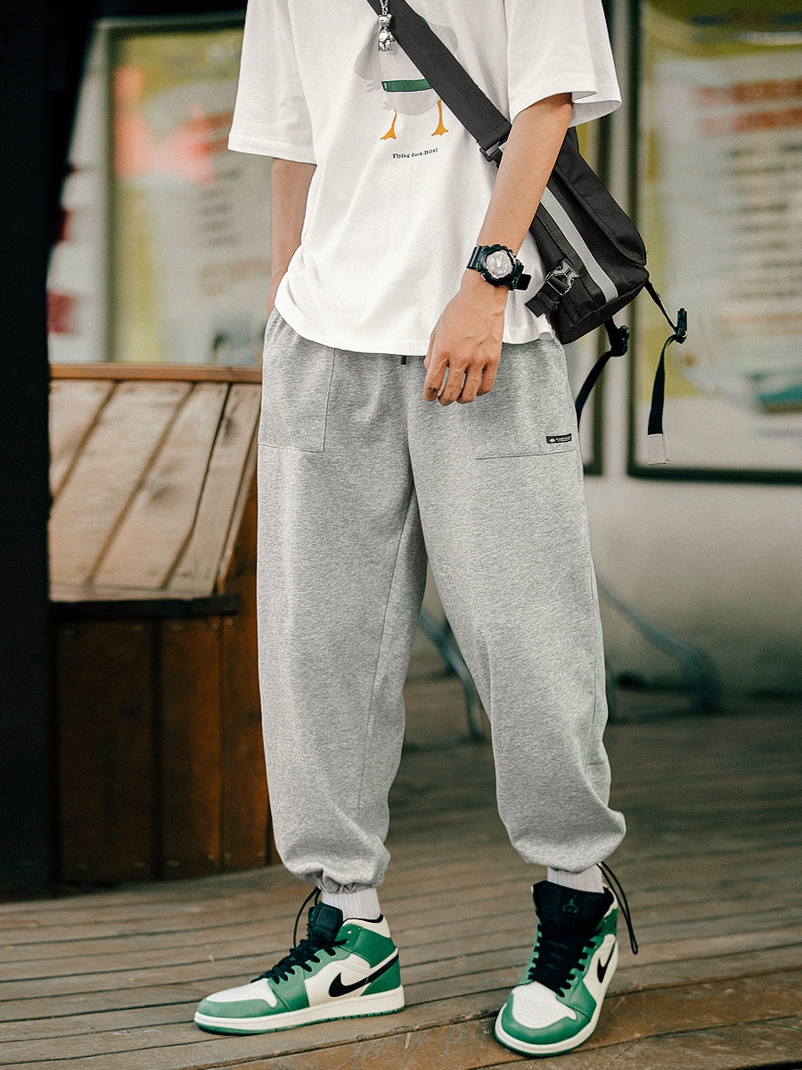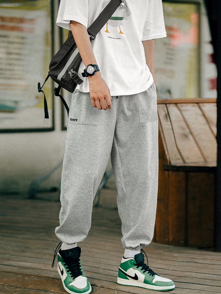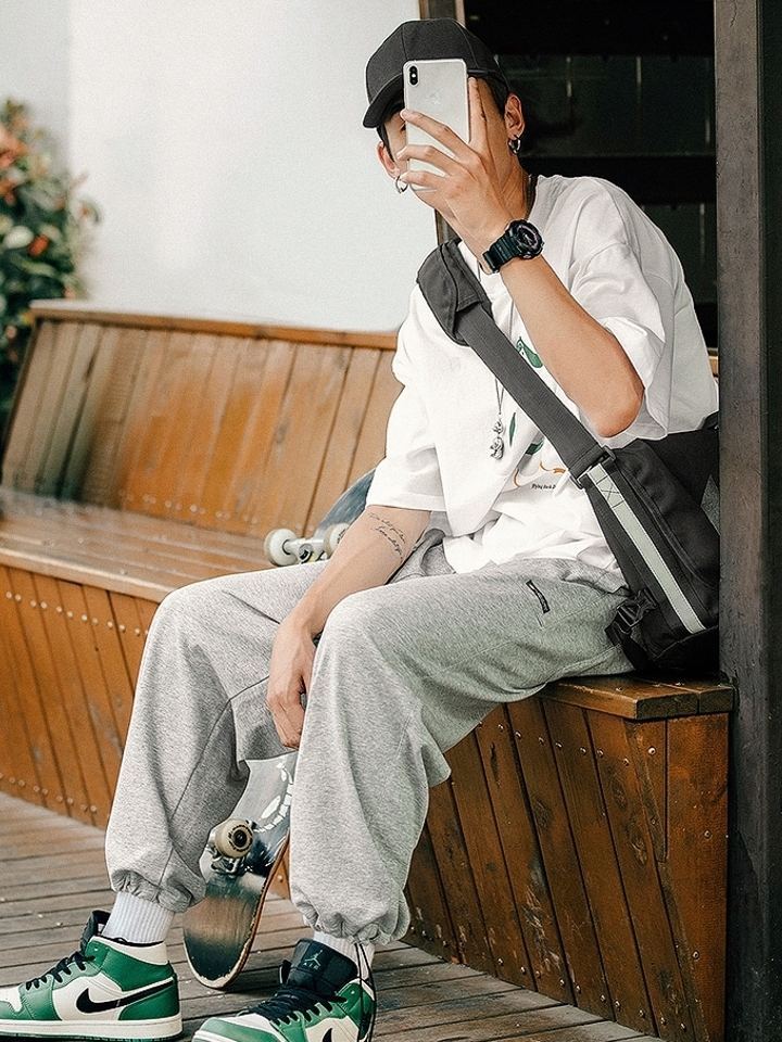 选用朴素自然的灰色,简约大方,方便穿搭。,做工细致有型,后身配有主题文字胶印图案,裤口为松紧束脚方式,设计感很棒。