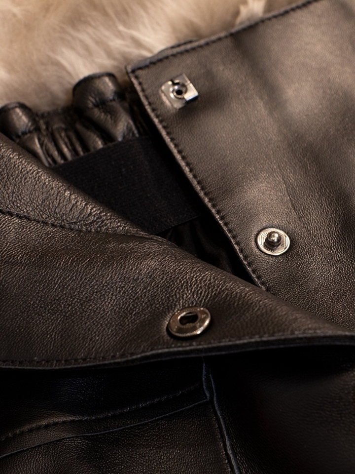 柔软舒适的绵羊真皮材质,透气亲肤,修身短款版型,收腰提臀,很好的展现性感迷人的双腿,简单易搭,怎么穿都帅气有型。为你增加帅气和女人味两种风格,进口的绵羊真皮,清晰的纹理,更能展现出品质气息。