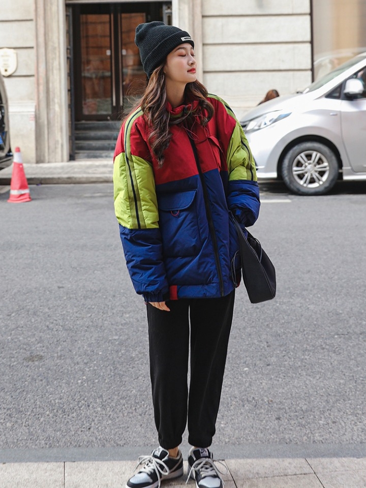 冬日是非常适合复古风的季节,这款为拼色棉衣,经典的色搭为你呈现出一股沉稳复古的气质!时髦的棒球领,干练的小短款,穿起来舒适自如。
