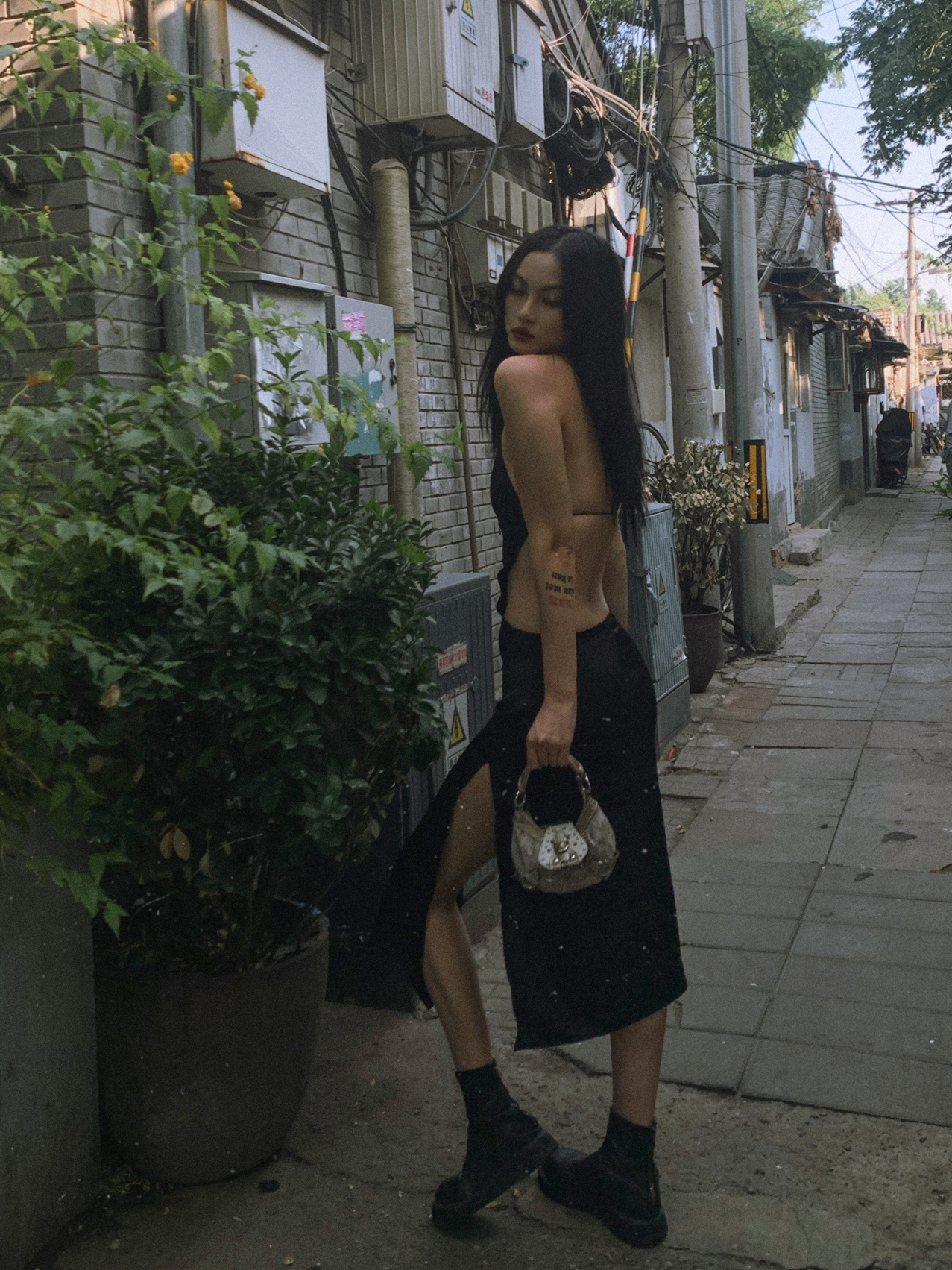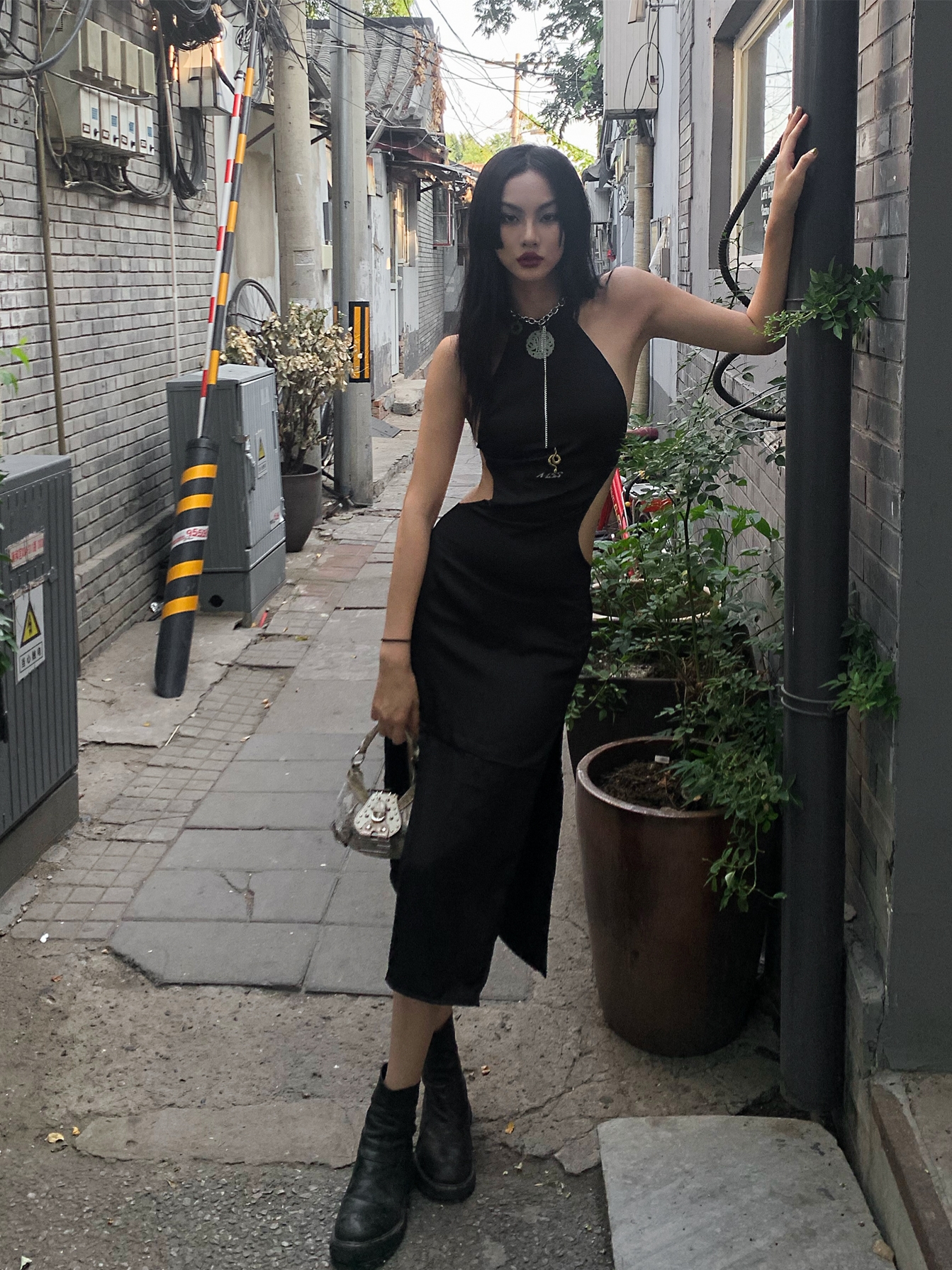 十足垂坠感的黑色挂脖连衣裙,流行的挂脖元素,简约的A字版型,有着非常好的显瘦效果,领口交叉镂空的设计,更好的展现出性感范。