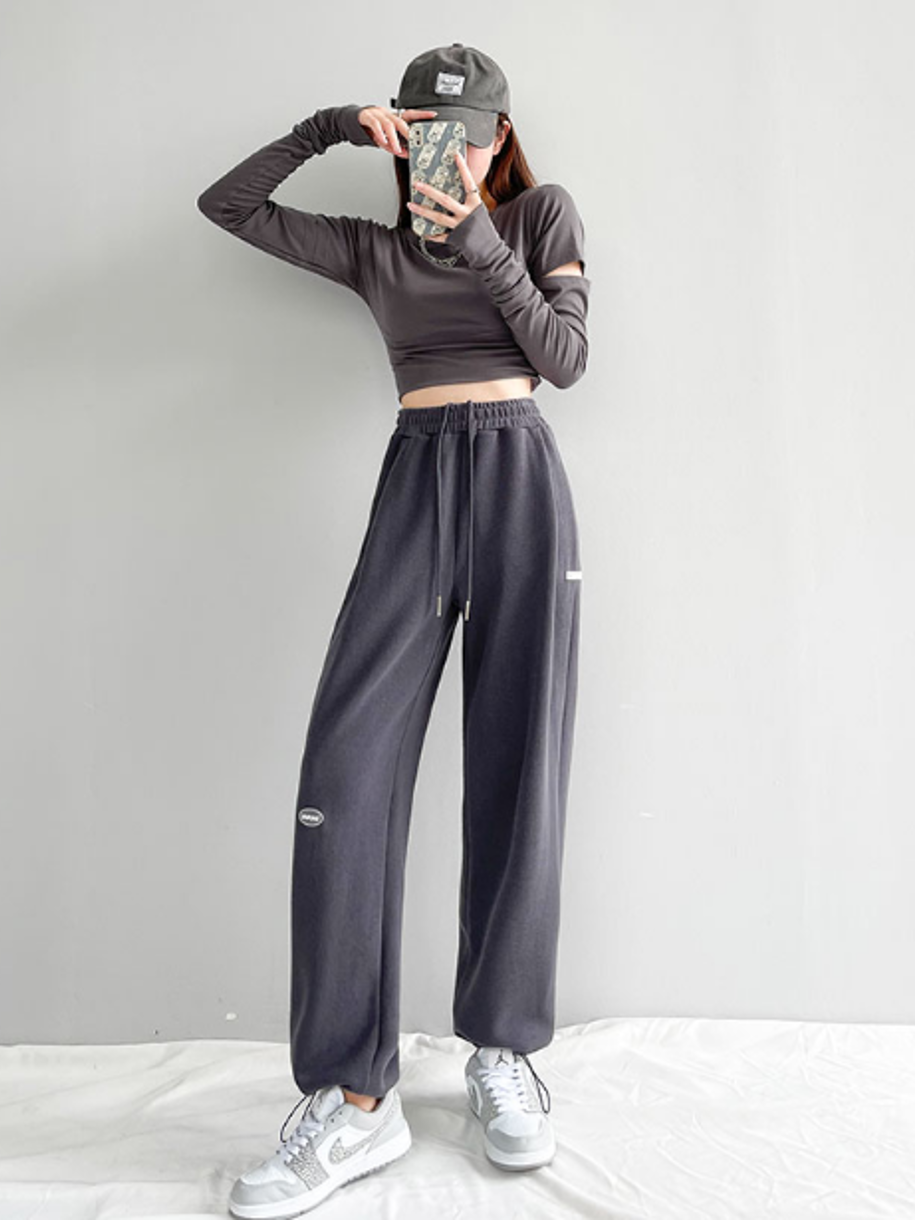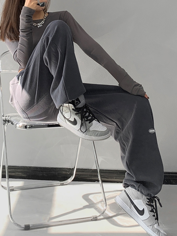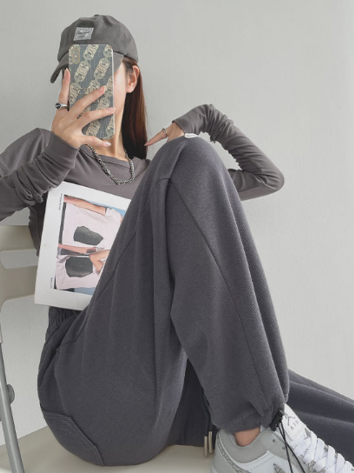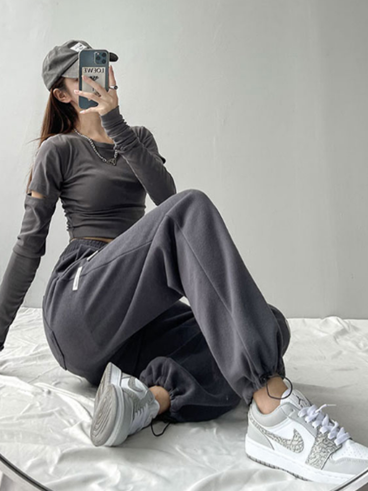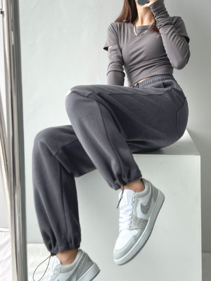 花灰色针织的薄棉面料,穿着舒适透气,微微吊裆的哈伦版型裁剪,亮点在于侧边拼接的立体大贴布袋,撞色的字母条块提升整体的层次感,松紧带束口的小脚口干练显气质。