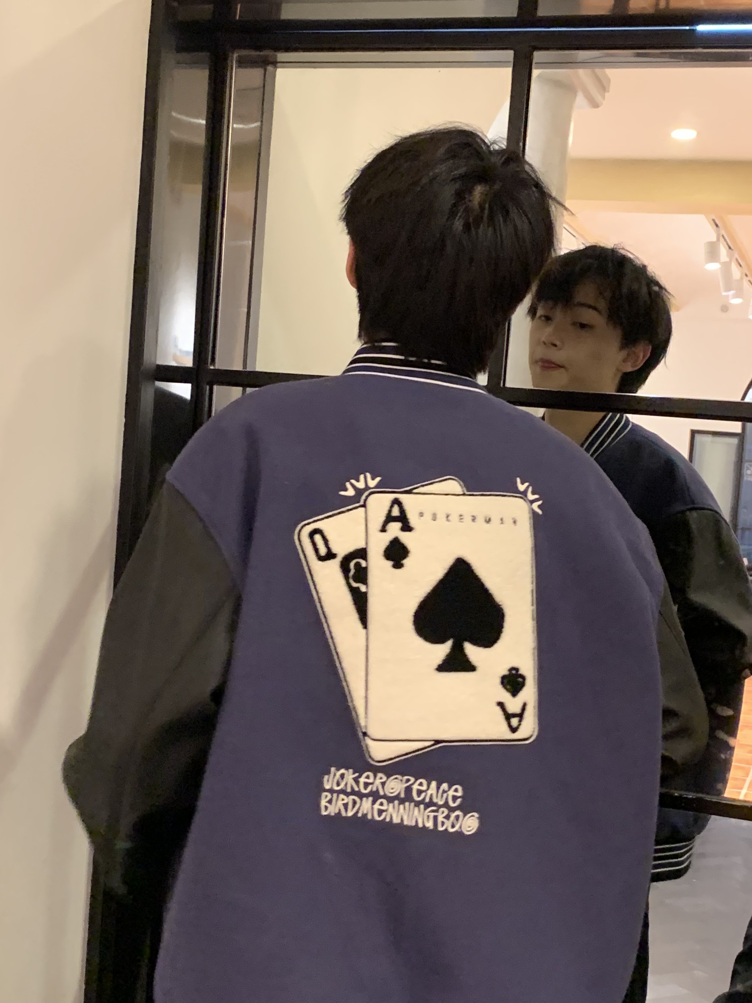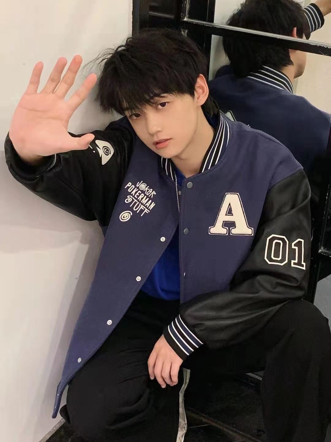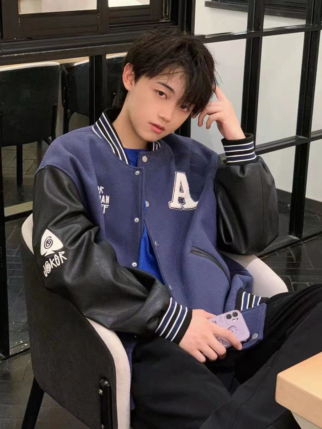 棒球服外套依然是这个秋天的流行款式,这件蓝色的棒球服看上去很帅气,宽松的BF风,搭配撞色字母装饰,更加有个性。