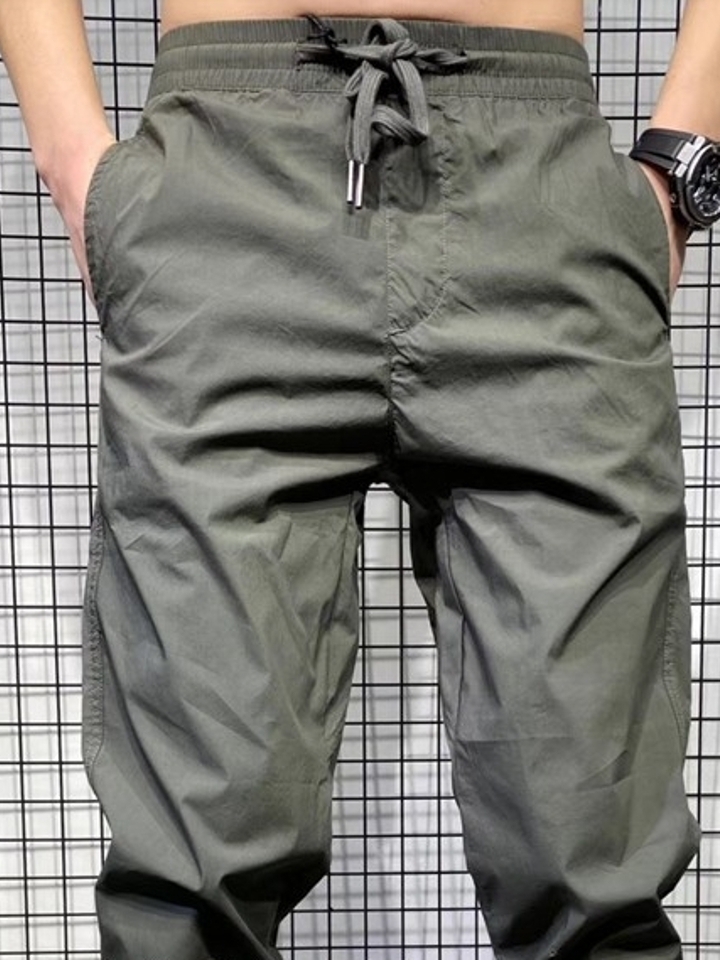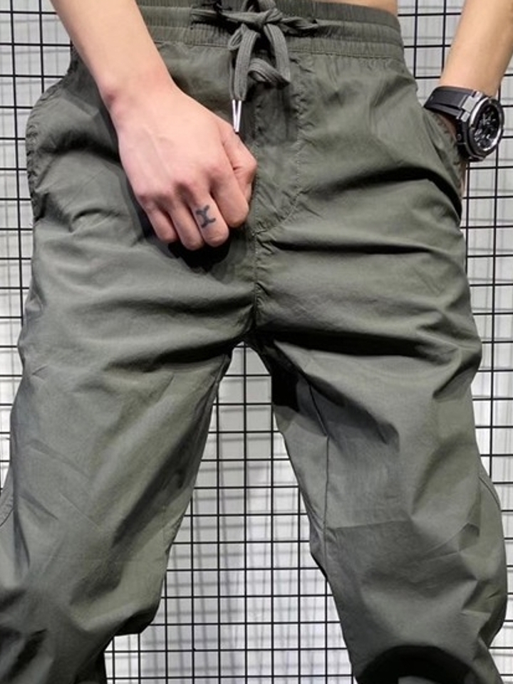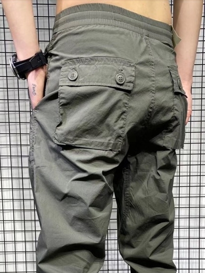 水洗工装裤,军绿色面料,充满军旅风,4口袋设计,个性时尚,军绿色系本身就带着浓厚的硬汉气质,再加上复古的工装裤版型,上身干练霸气。两侧的立体大口袋实用美观,松紧束口的裤脚设计包裹感十足,上身舒适。