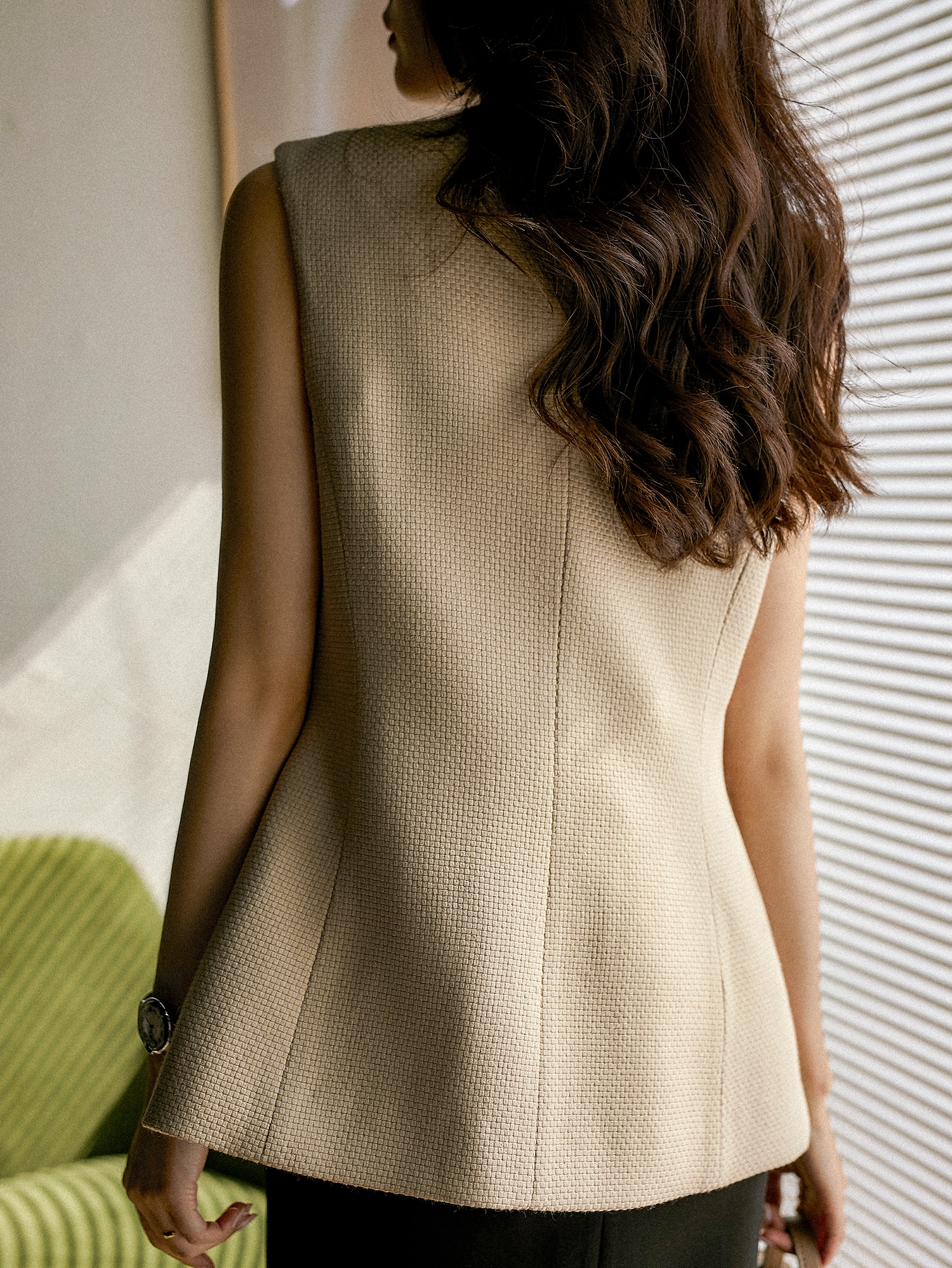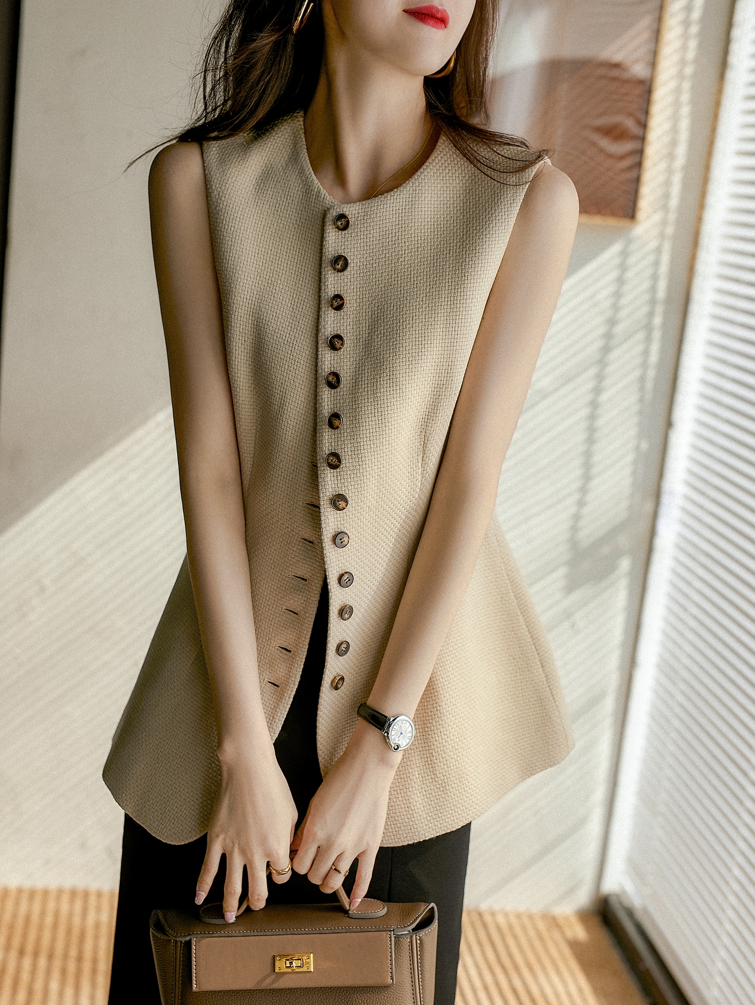 整体清爽干净利落的裁剪,有种说不出的美感。简洁大气的圆领单排挂扣门襟,方便穿着。