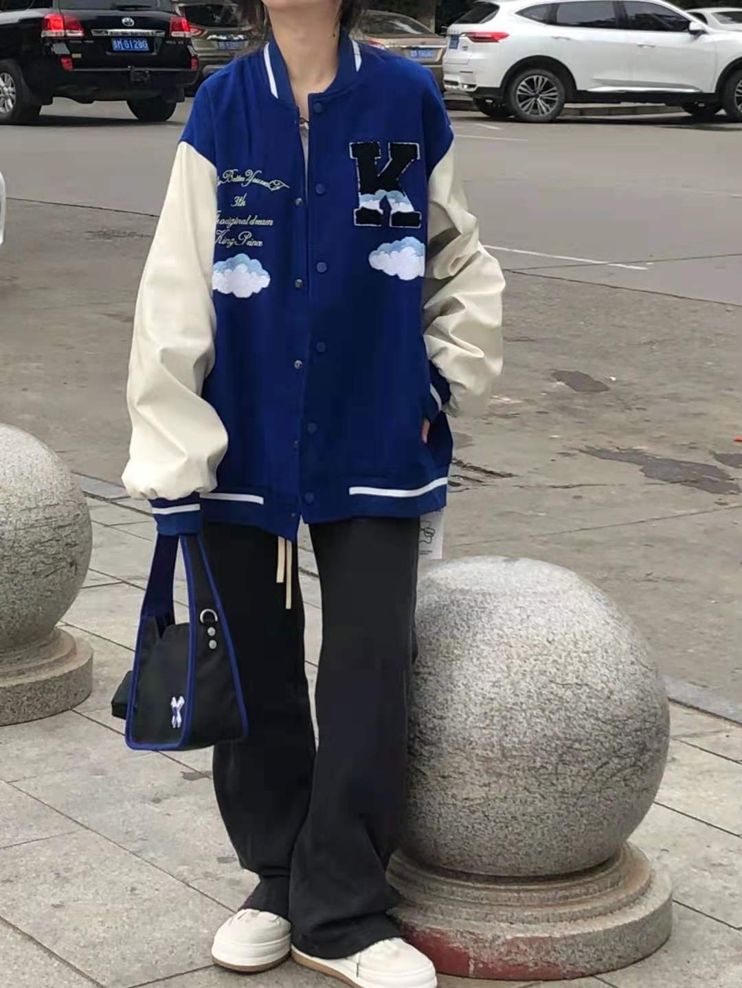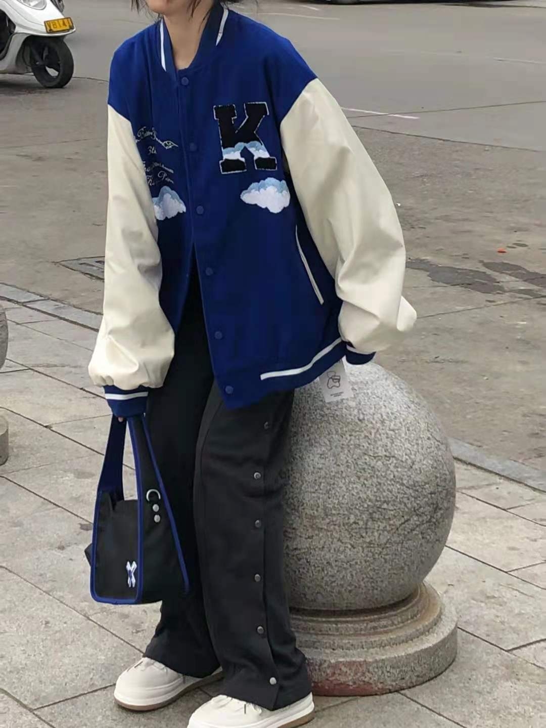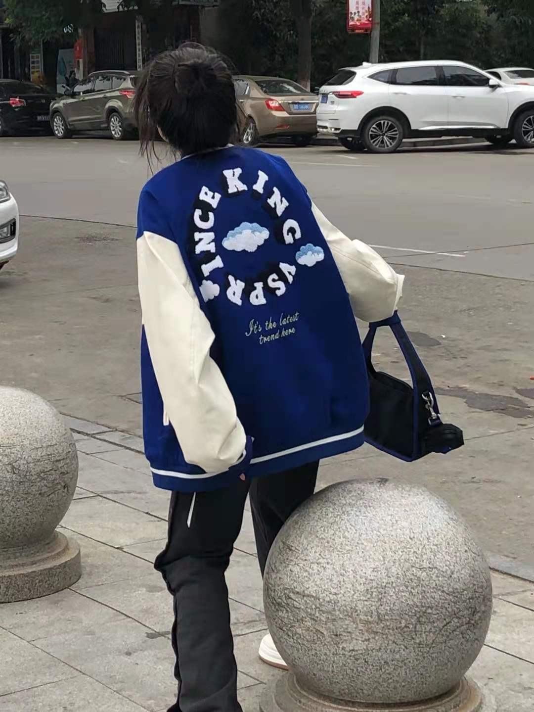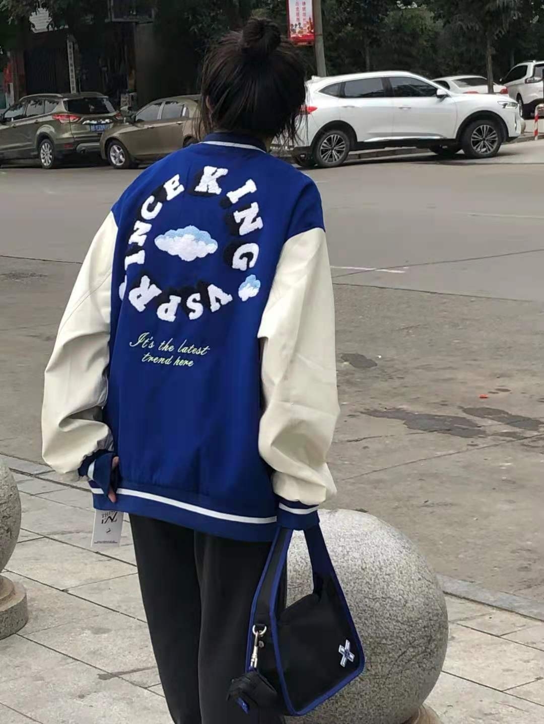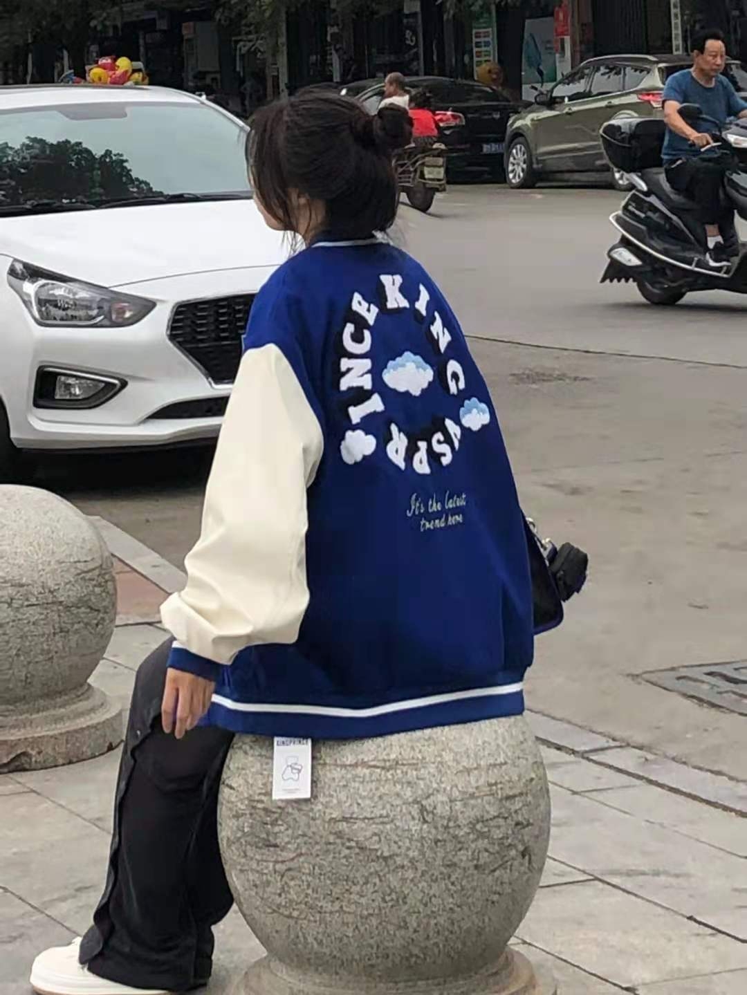 这个棒球服是很显白的克莱因蓝,袖子是米白色的皮质布料,颜色的搭配就很和谐。