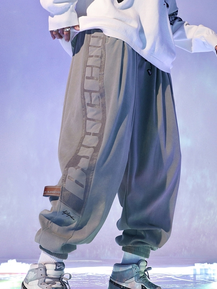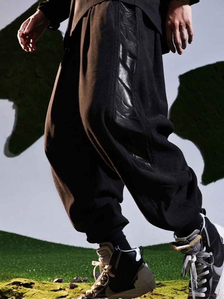 采用粗针织的手法,松松的织法,能够打造出比较软密度不高的那种针织面料,上身也会比较舒服,带点运动裤的感觉。但在版型上是做的锥型剪裁,与街头接轨,前幅的两个插袋位置也是非常具有不同的特点。