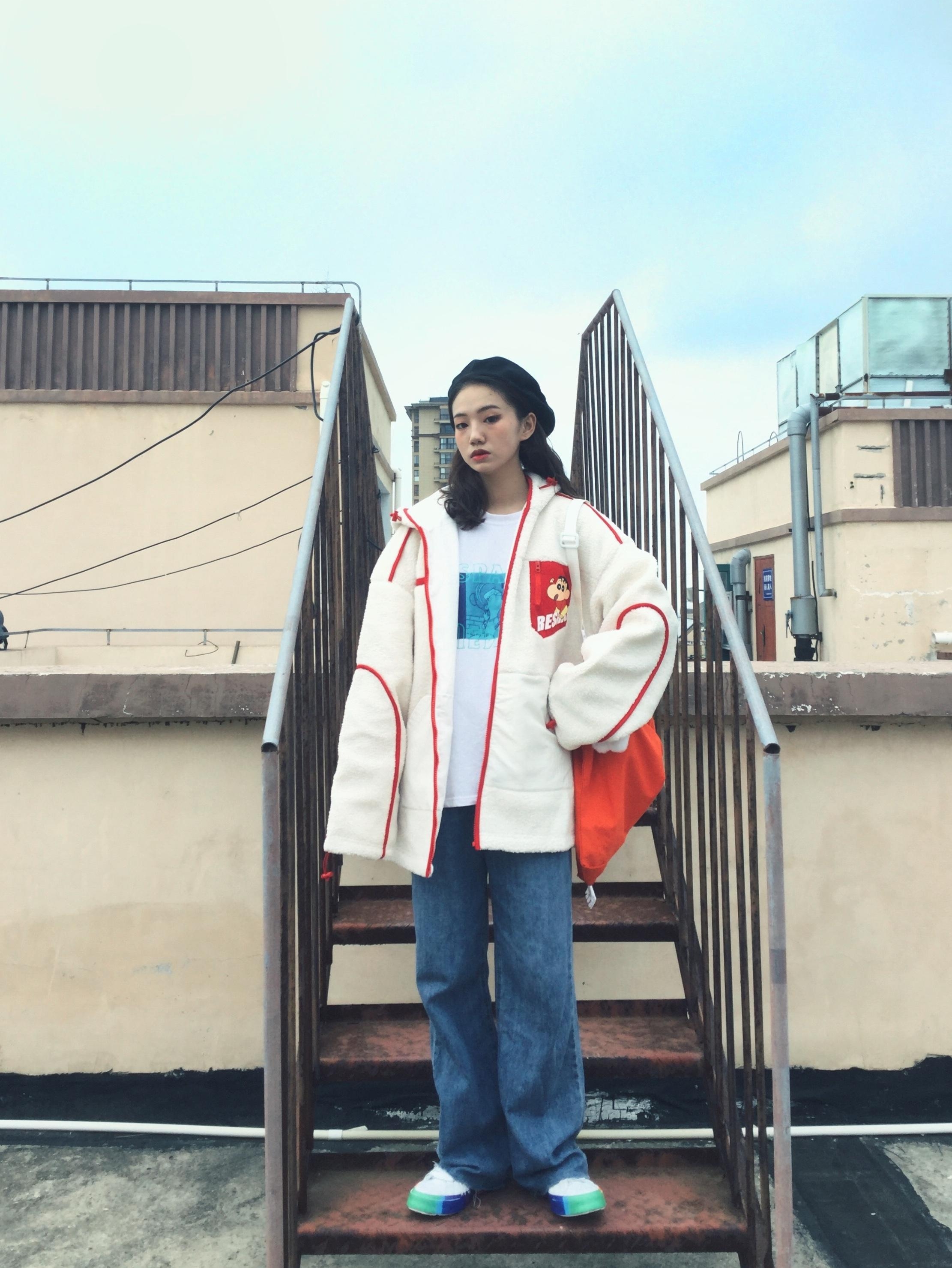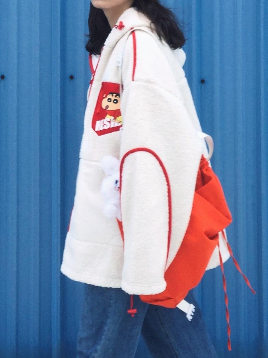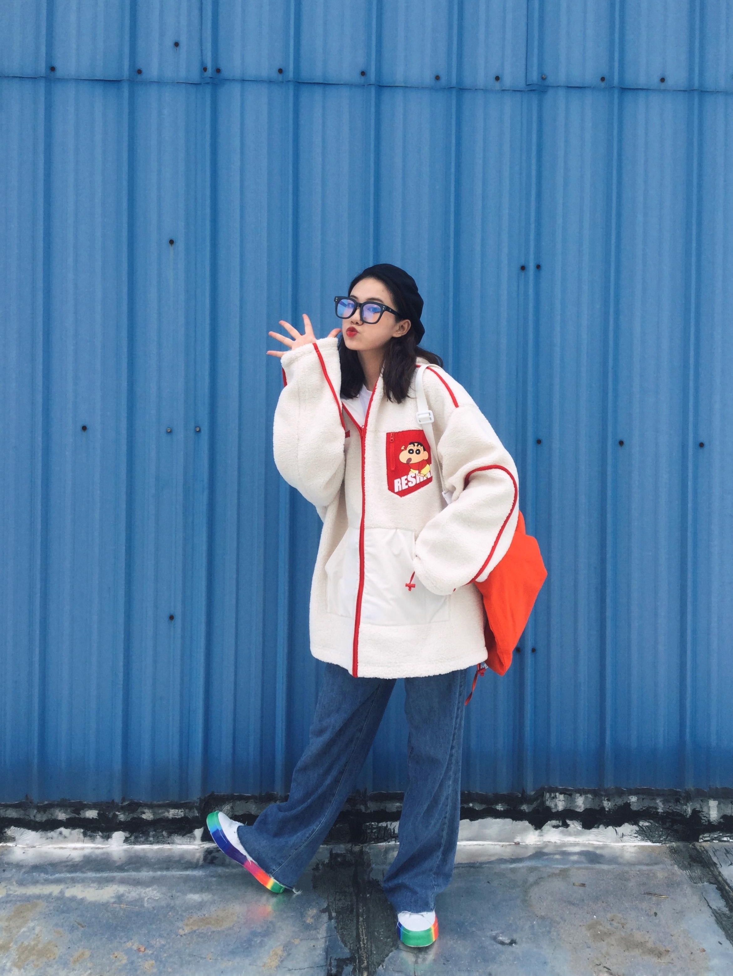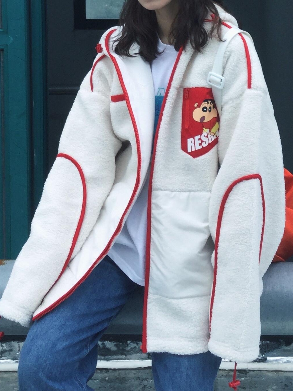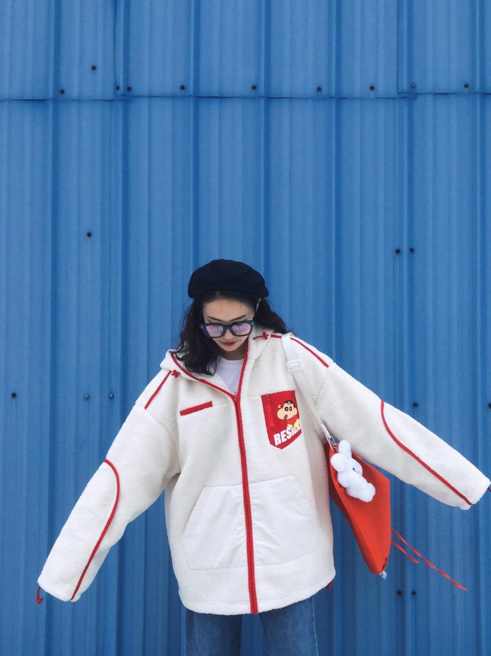 Reshake软萌可爱的羊羔毛外套,裁剪利落,宽松oversize的版型,穿着立体显瘦,尤其是简洁的短款设计,穿搭更加得心应手。白色的大身颜色搭配红色包边,让外套立刻立体活泼起来,胸口蜡笔小新调皮可爱的形象,让街头风也多了一份童趣。宽大的版型百搭不挑身材,即使是身材娇小的女生,也是轻松hold住!