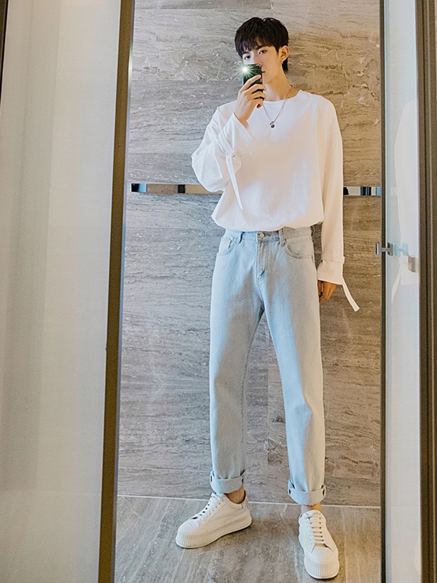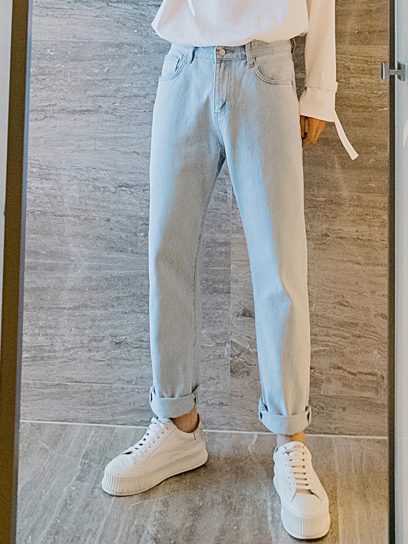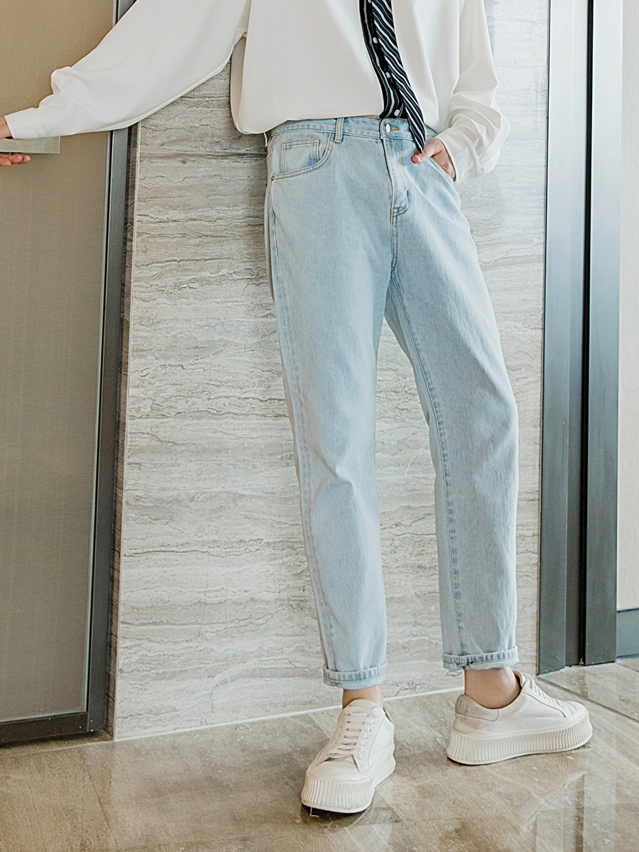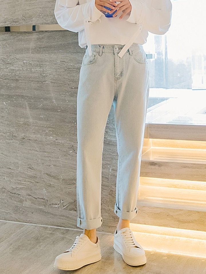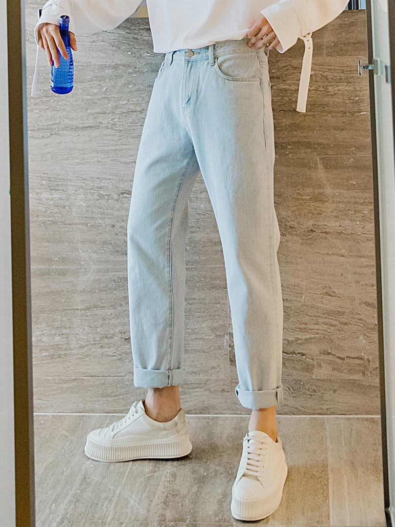 干净利落线条刻画出的宽松直筒裤型,从容抒写轻松自在姿态,腿部些许不足也被有效修饰隐藏,深浅度刚好牛仔蓝色调,让人看多少遍都不会觉得索然无味,并与形形色色上衣悠闲组CP,露出一截脚踝的九分裤长,与各式鞋款皆相配,随性毛边环绕,洋溢时髦调调。