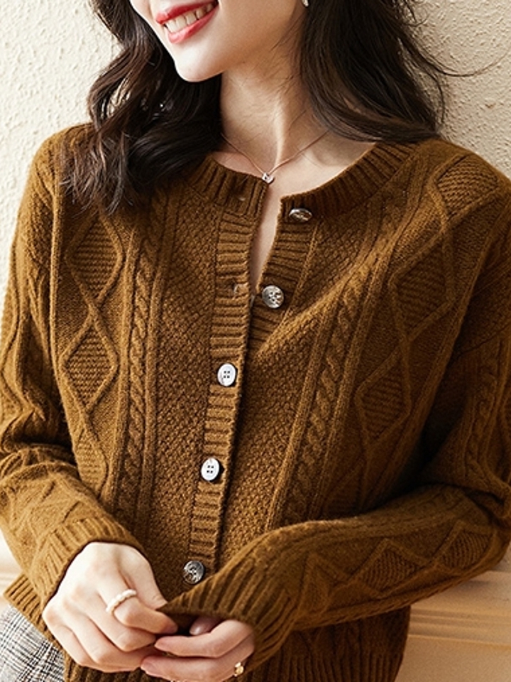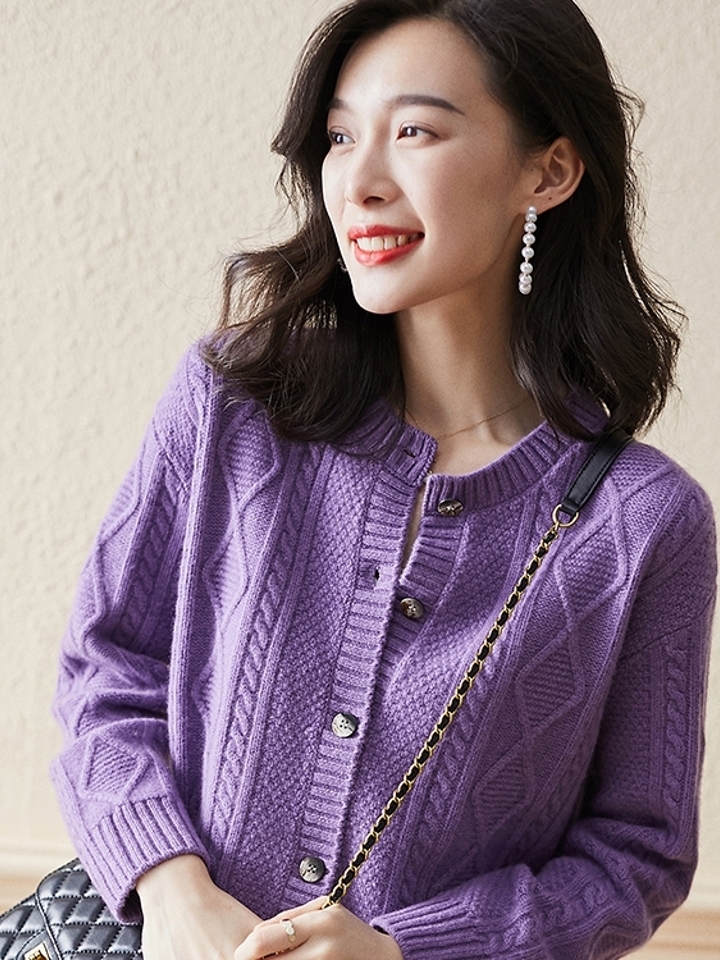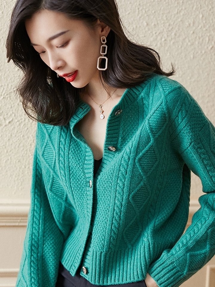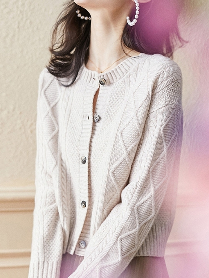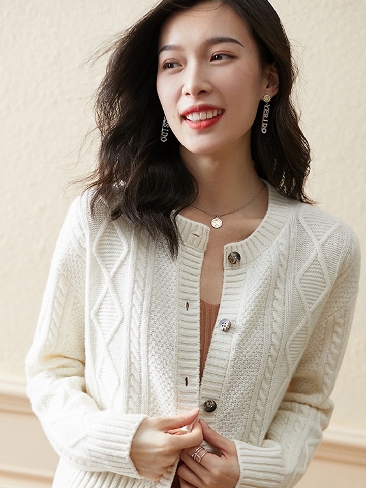 此款针织开衫,经典百搭圆领,贴合颈部,温暖亲肤。