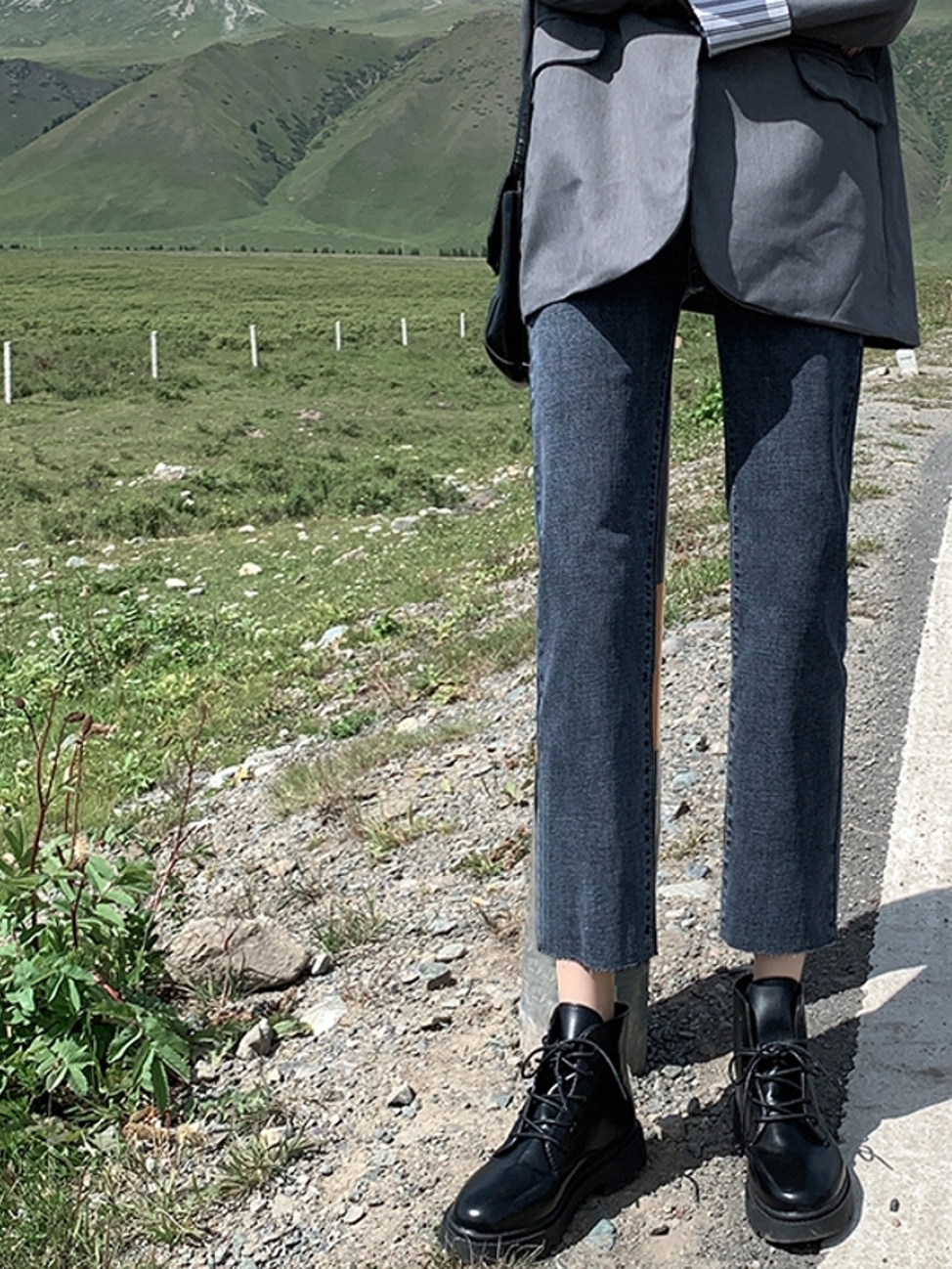 高腰设计,拉长身材比例。高腰牛仔裤,显瘦显腿长。直筒裤型,修饰腿部线条。