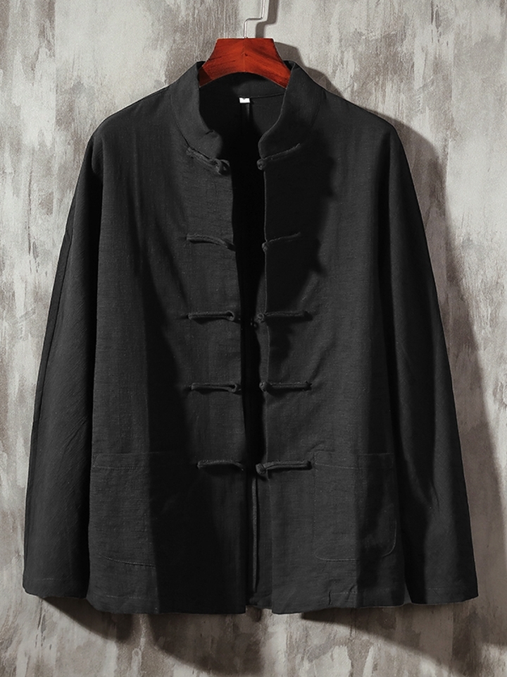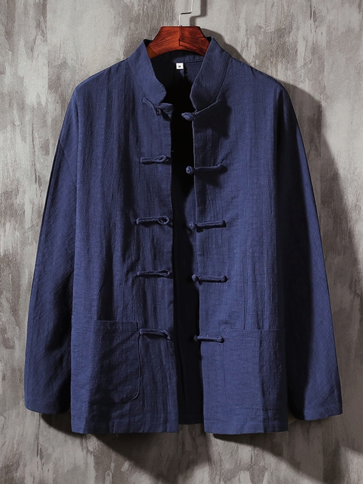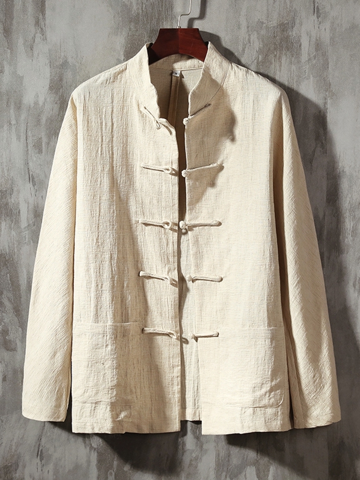 圆立领搭配精致盘扣门襟,既丰富了视觉美感,又能彰显原汁中国风韵调。亚麻棉混纺质地,富有肌理感,穿起来舒适自在。搭配合体长裤,释放中式型男气质。