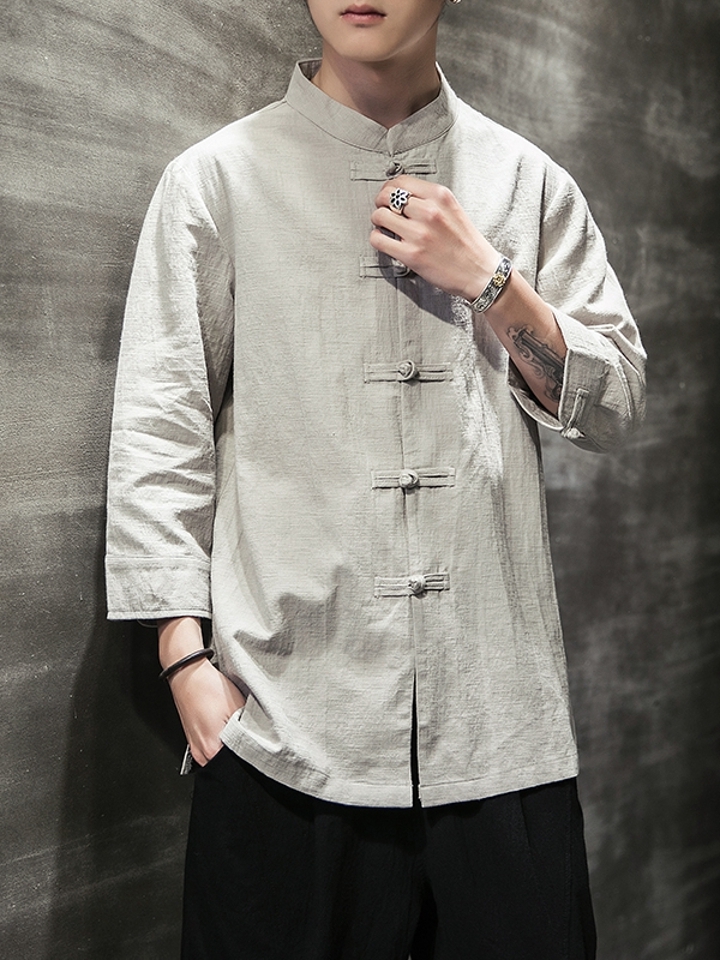 中式潮牌蕃古,本季推出了这款衬衫,中式立领搭配一字盘扣门襟,透出原汁中国风格调。前幅两侧一字口袋加入,提升纯色衣衫的设计感。与纯色休闲裤搭配,再加入布鞋,禅意十分。