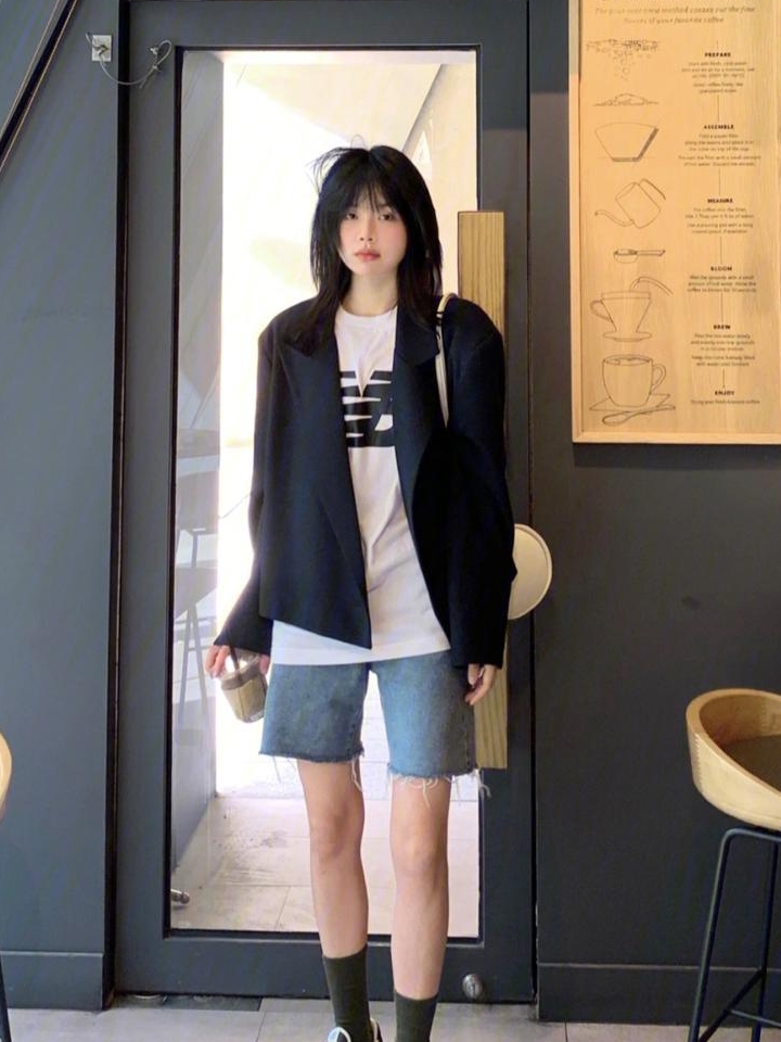 简约的高腰设计,搭配上修身的版型,上身显瘦又显高。