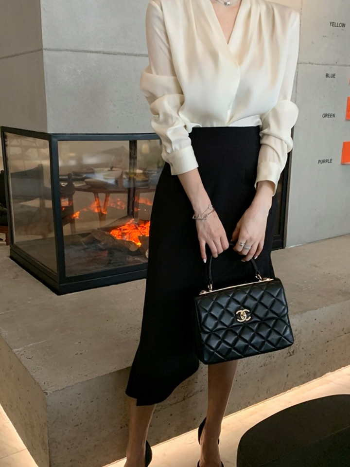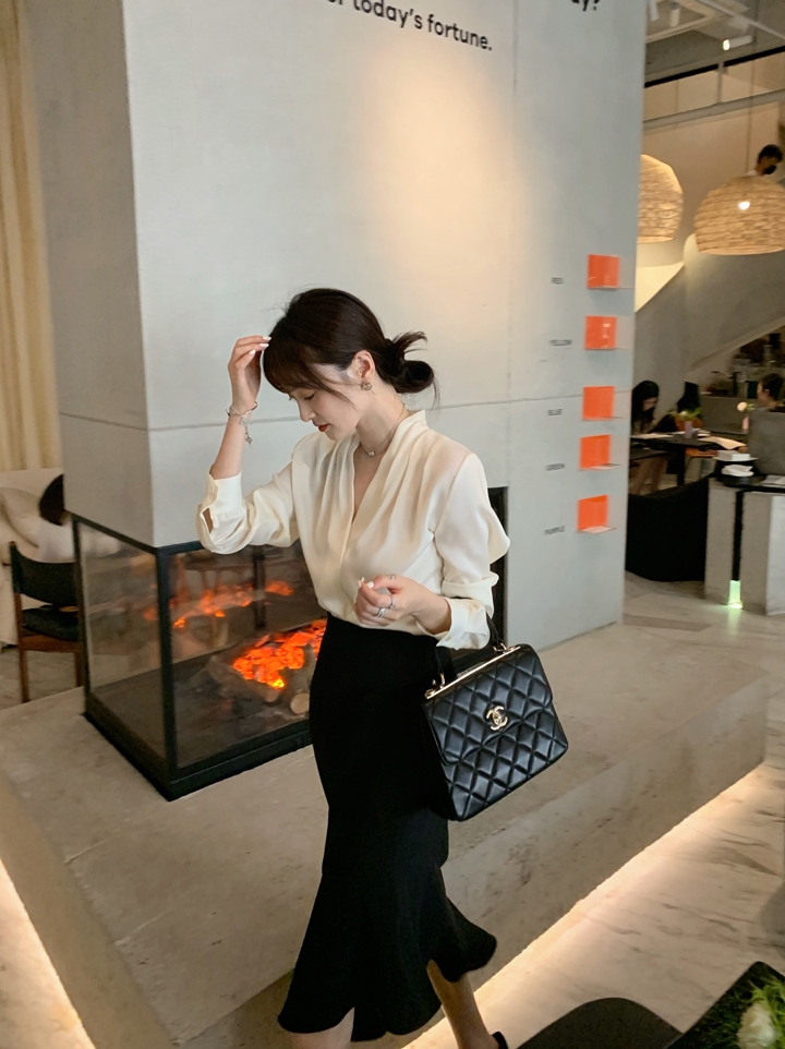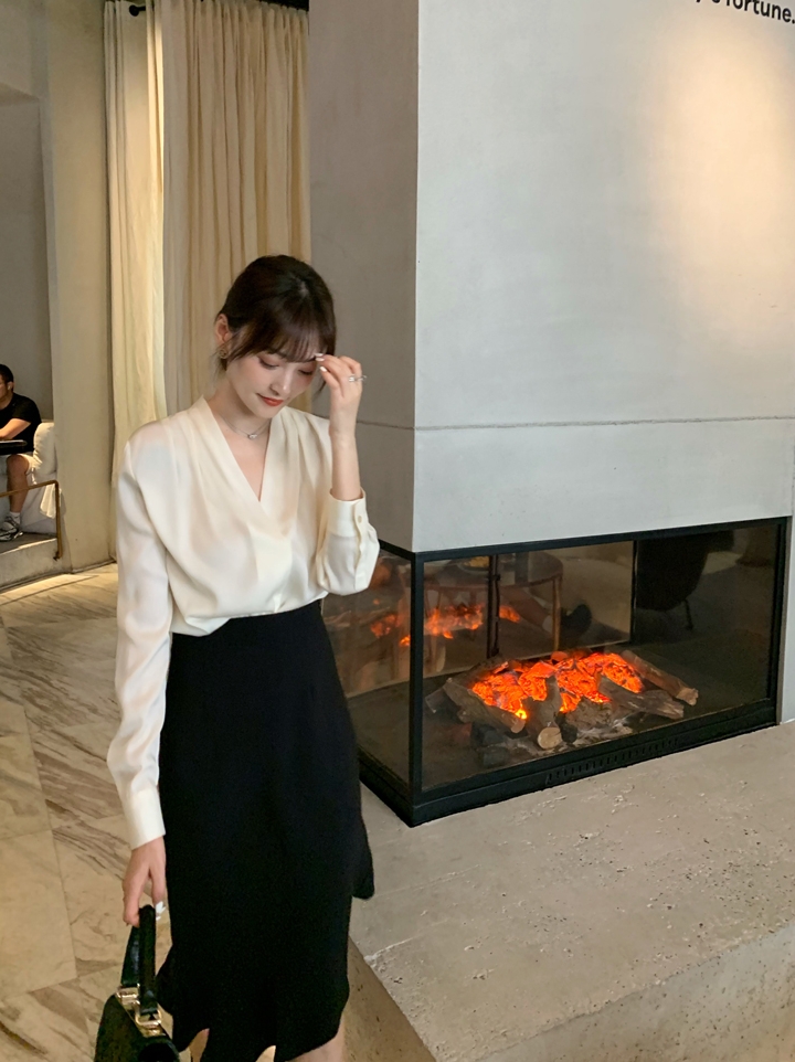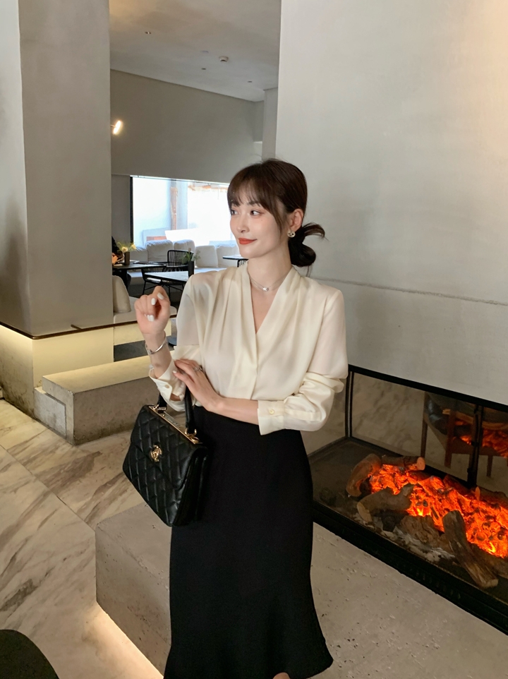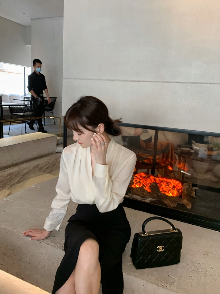 由丝滑而垂坠的面料打造的宽松衬衫,光泽自然饱满,时髦V领修饰脖颈线条,搭配宽松的廓形,带着几分慵懒的小性感