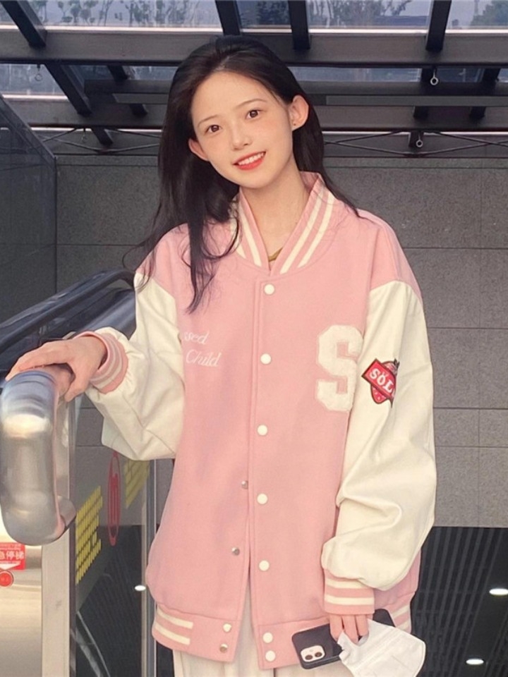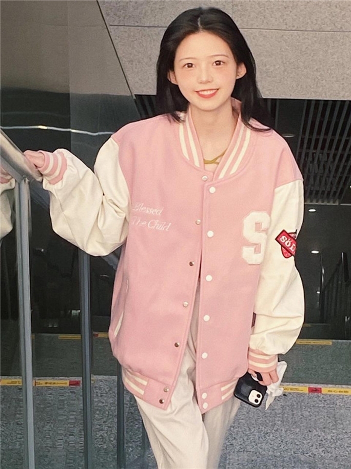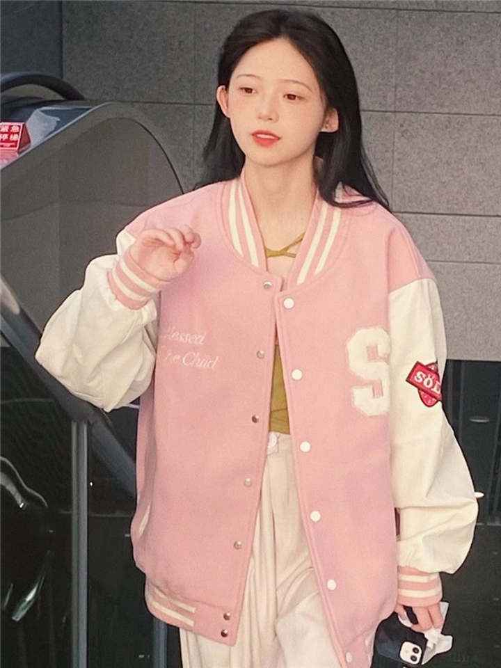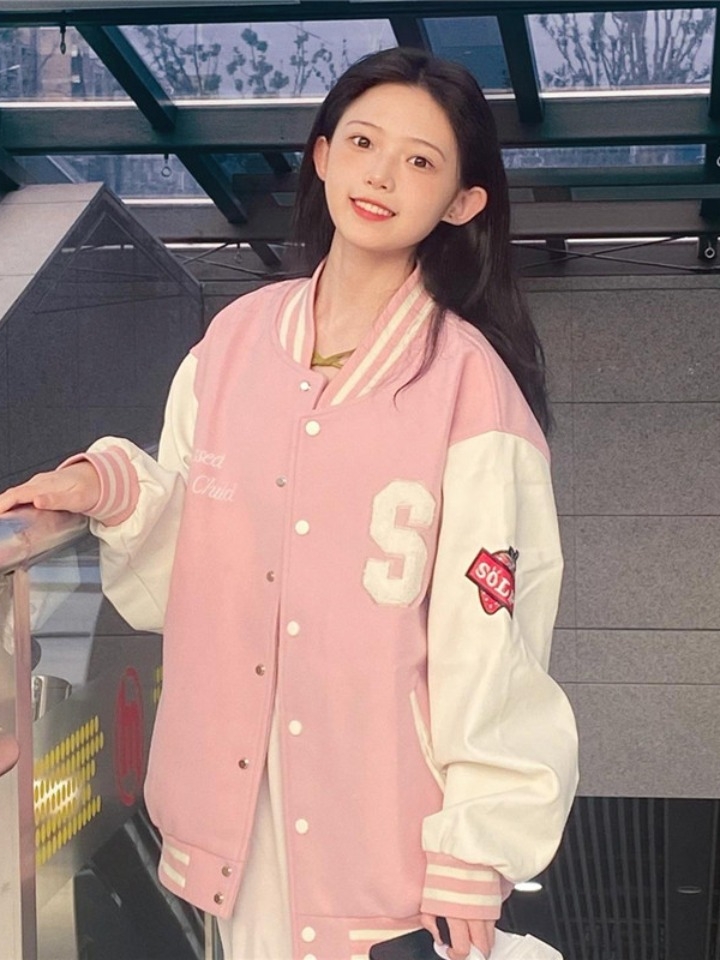 时尚的棒球服款型的夹克,男女同款。粉嫩的颜色,衬肤显白;螺纹的领口贴身舒适更有保暖性。胸口与袖子上的撞色刺绣,工艺精湛,是整体的画龙点睛的效果。