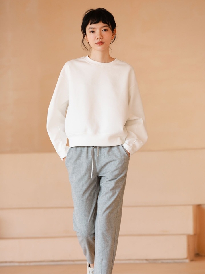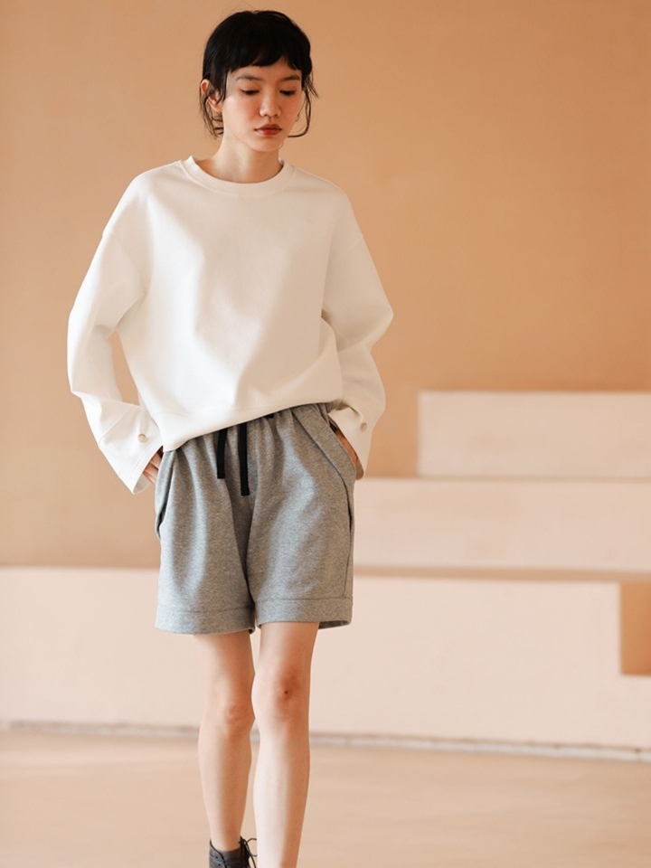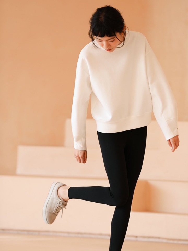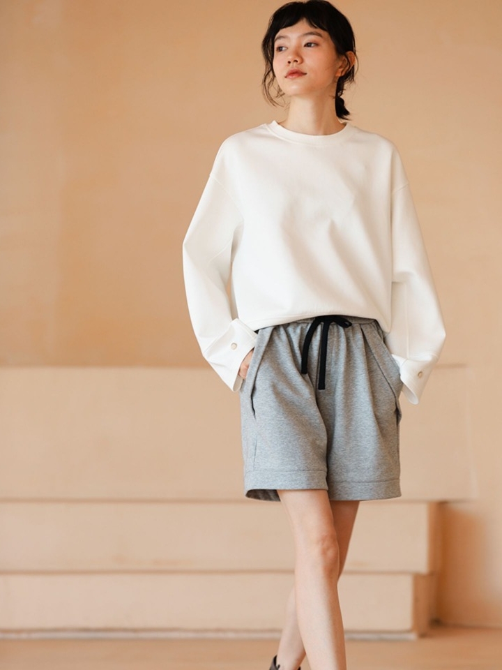 设计师崇尚简约随性的设计风格,沿用套头版型,融合插肩袖的设计,没有拘束感,而且便于日常穿脱。纯色含棉材质,具备良好的弹性,手感柔和细腻,可塑性强,能充分满足日常穿搭的需求。