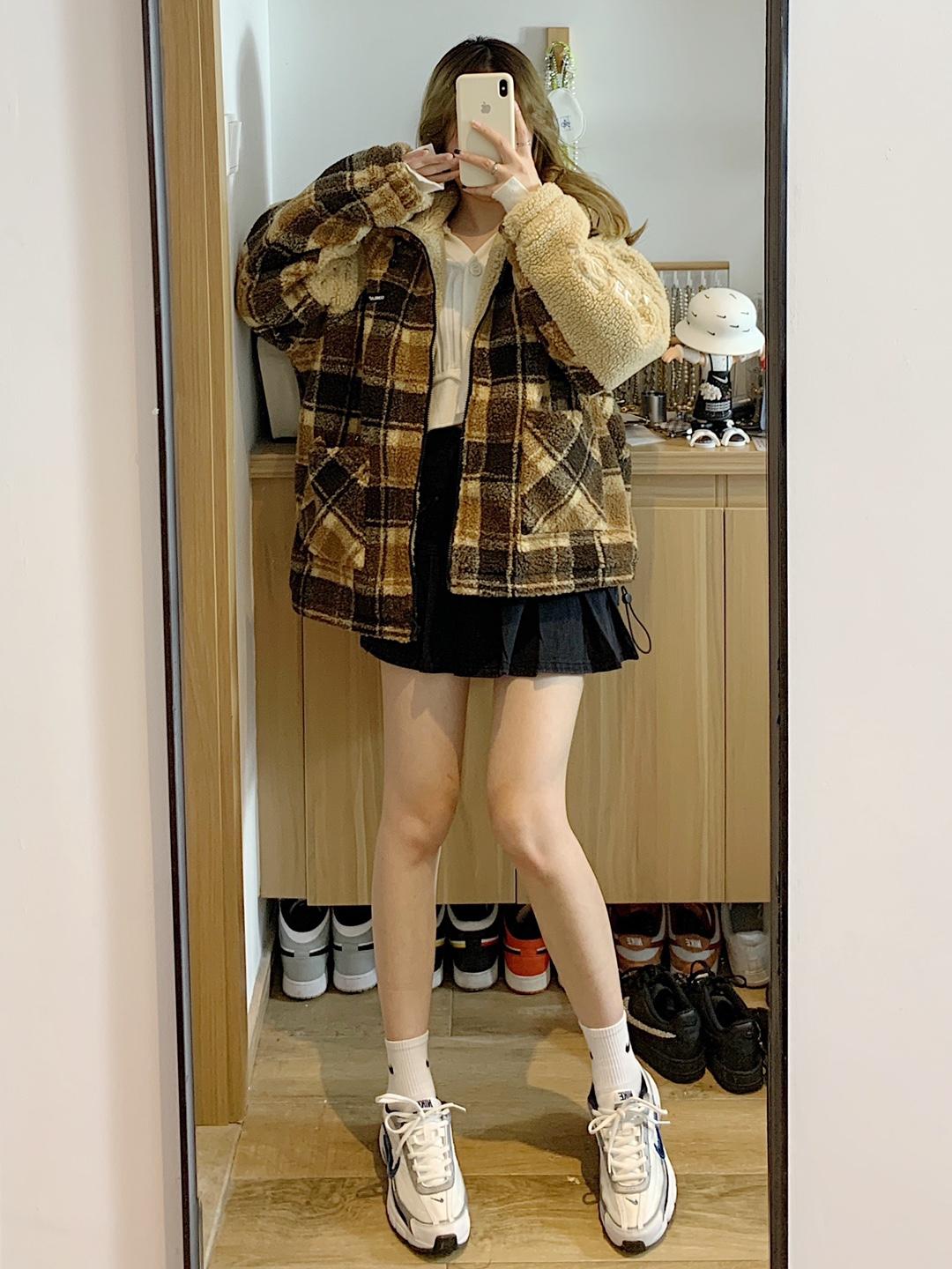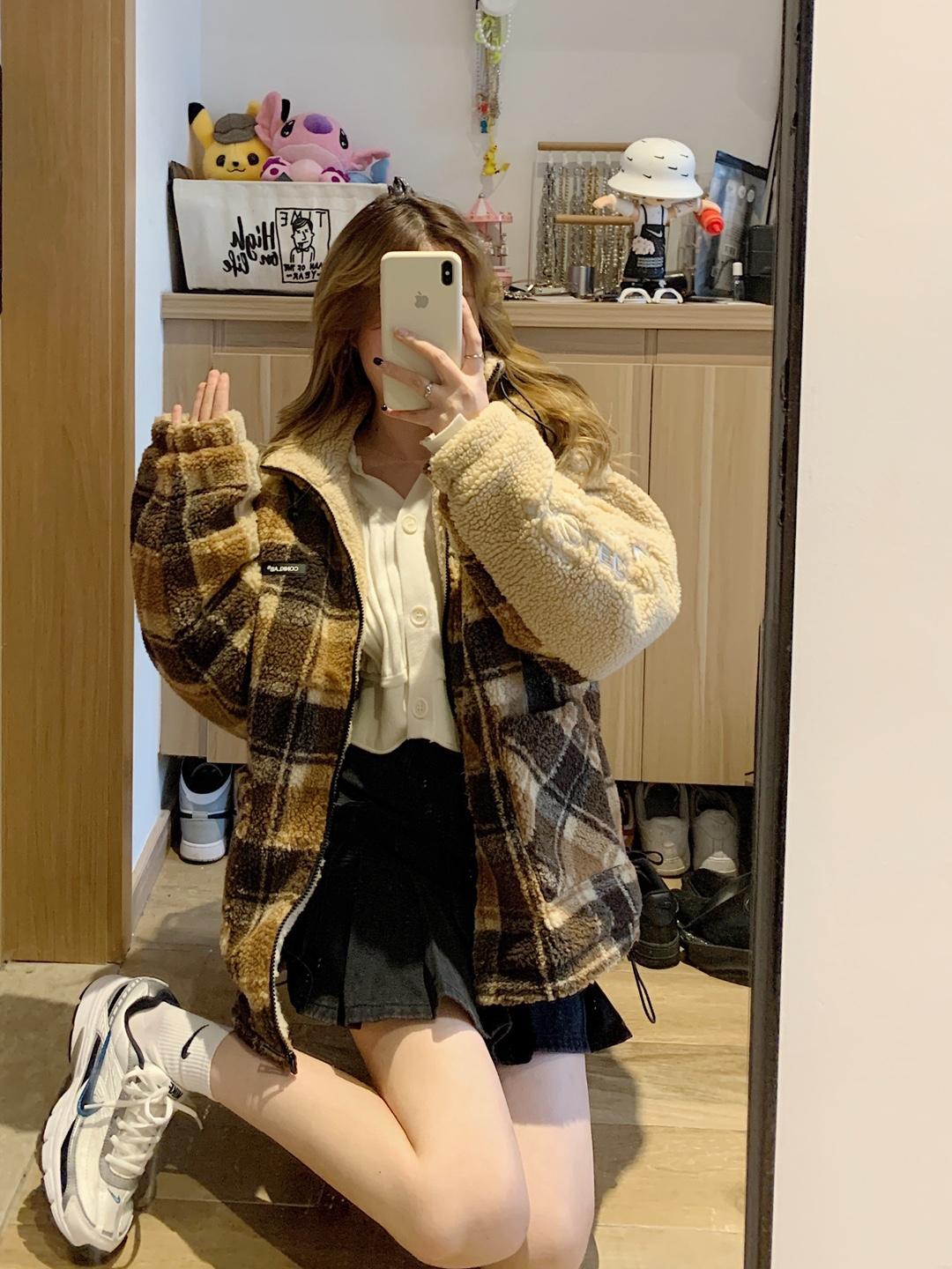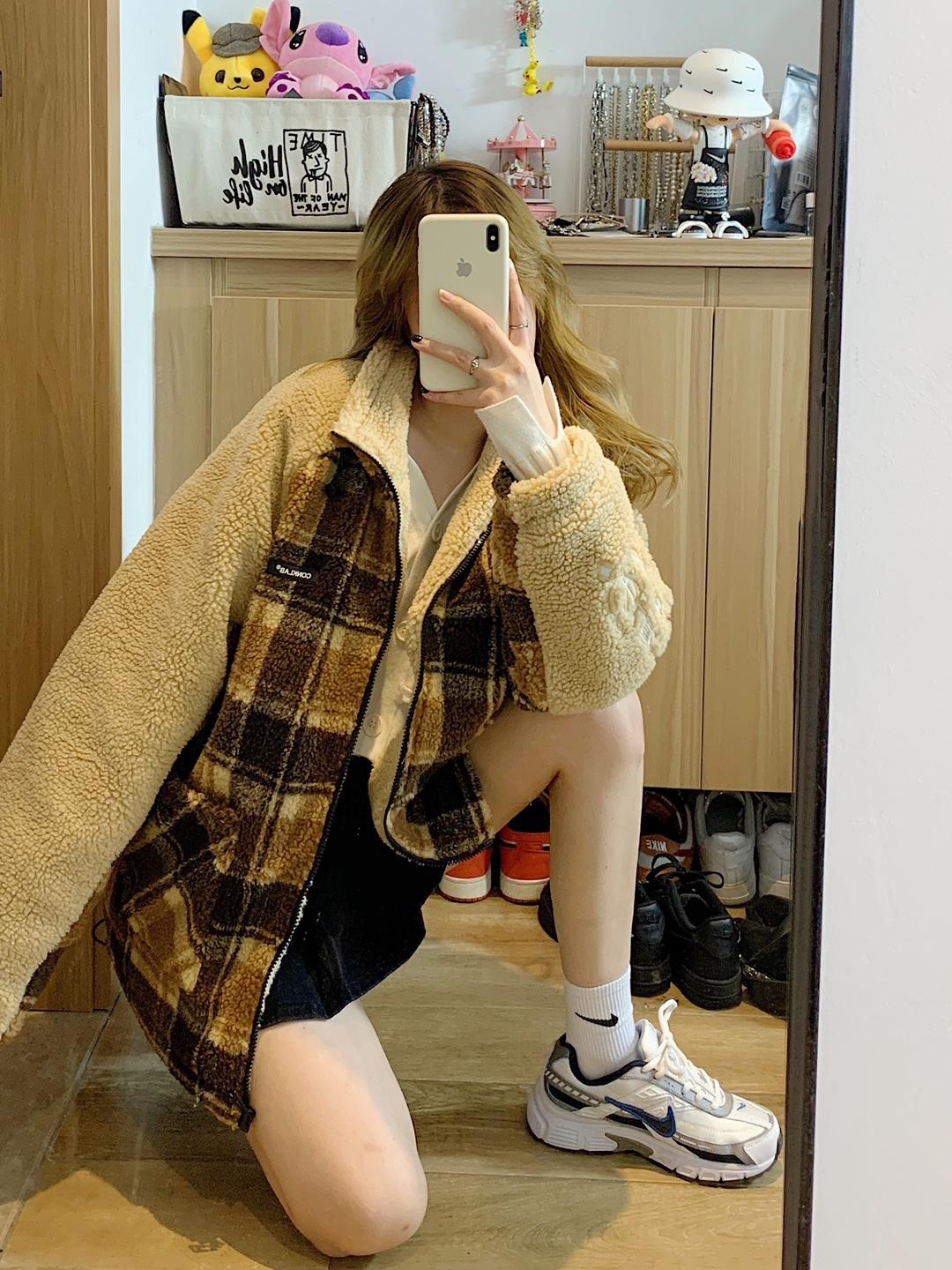 短款的羊羔毛外套采用撞色格子拼接,背后增添印花装饰。