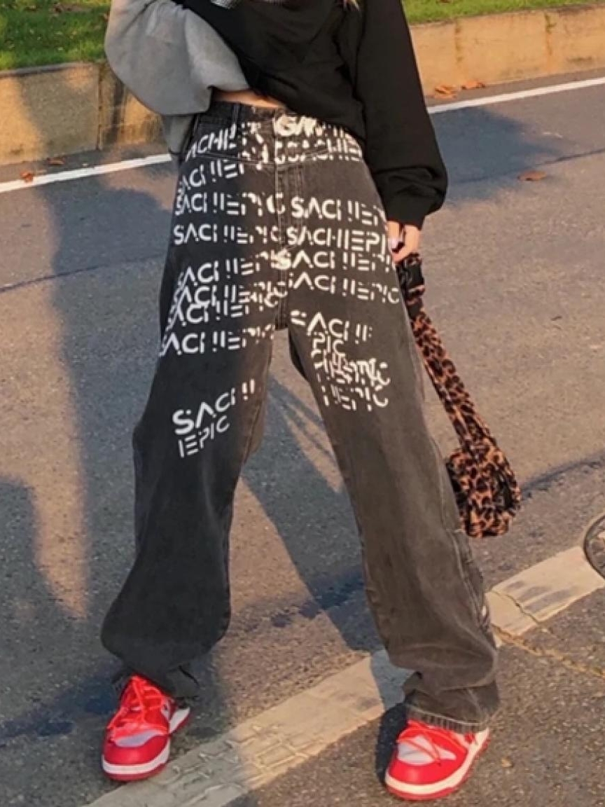 高腰设计,拉长身材比例。高腰牛仔裤,显瘦显腿长。直筒裤型,修饰腿部线条。