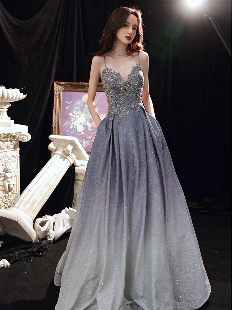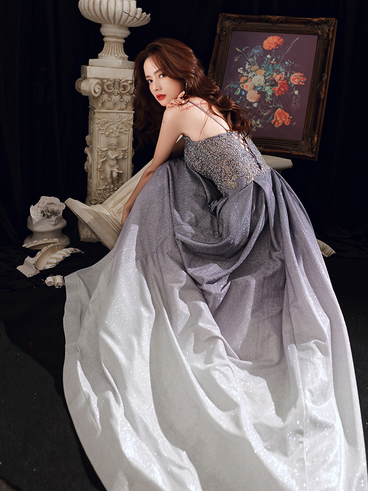 这件礼服裙设计典雅具有优雅气质,大V领露胸设计多了几分含蓄之美,很显瘦。高腰设计拉高身材会更显瘦高。蕾丝花型唯美,层叠的纱朦朦胧胧,银灰色挺惊艳的。这款真心美,参加活动主持晚会,聚会中艳冠群芳,轻易当女神。穿上它,一秒变全场焦点。你看这款可以吗?