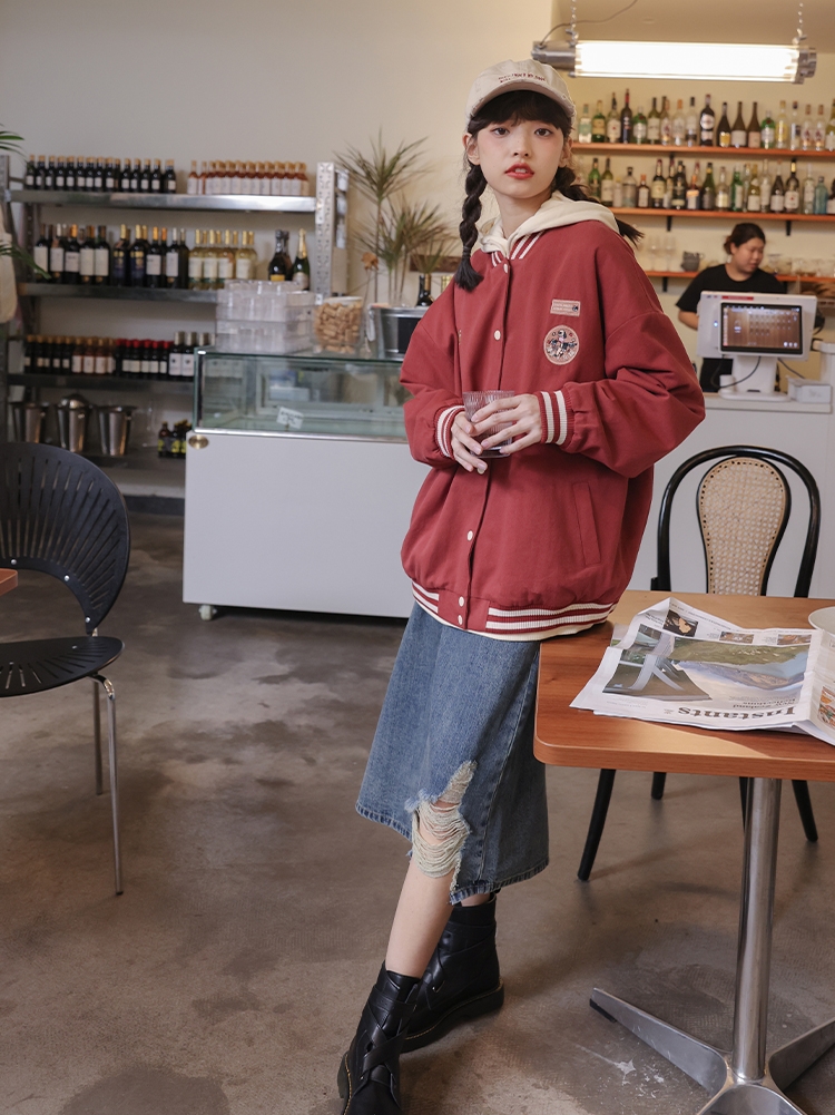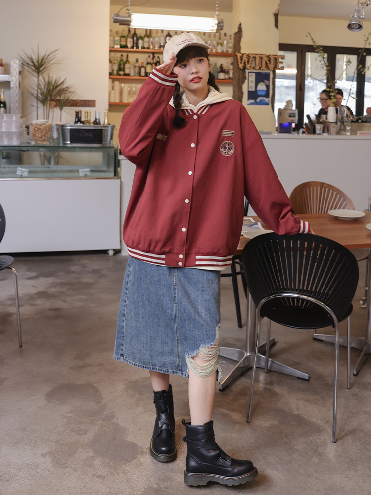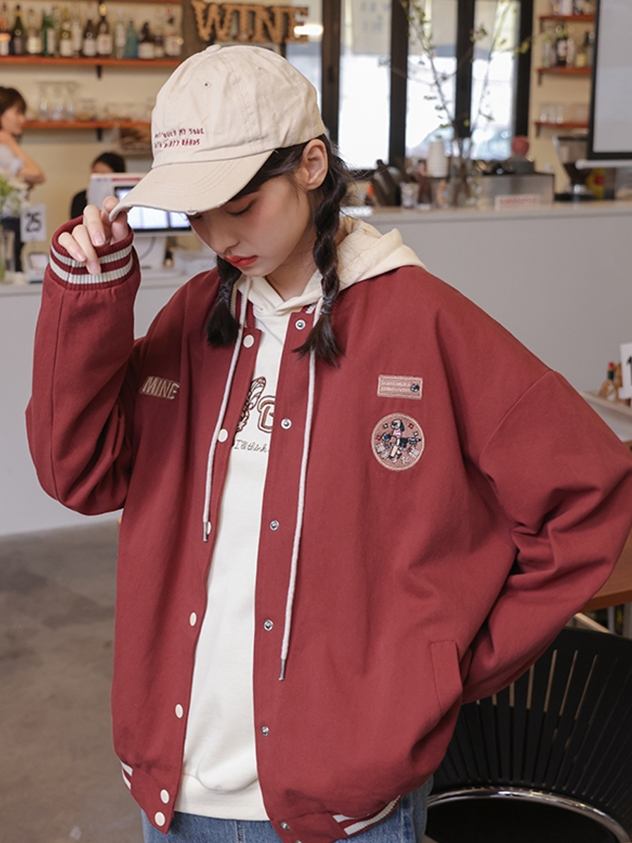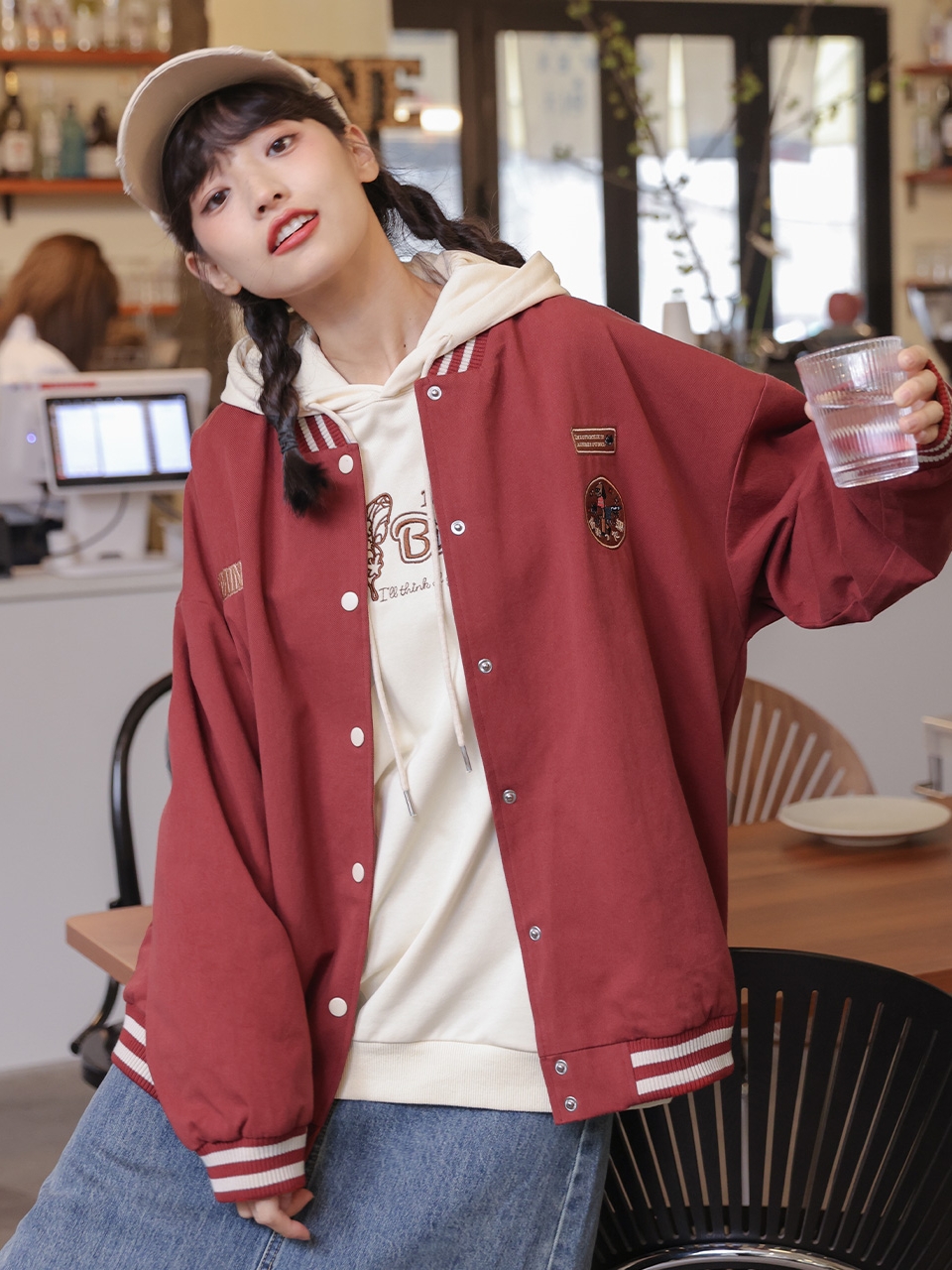 潮感十足的针织长袖口拼接光滑面料,帅气利落的短款外套,结合棒球服的版型设计, 宽松的BF风