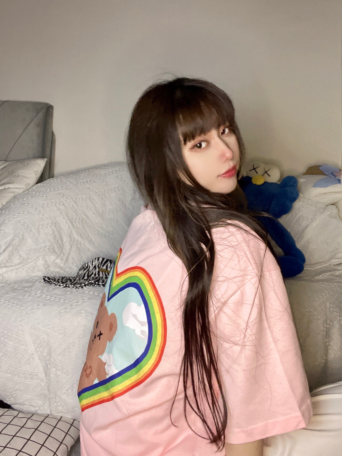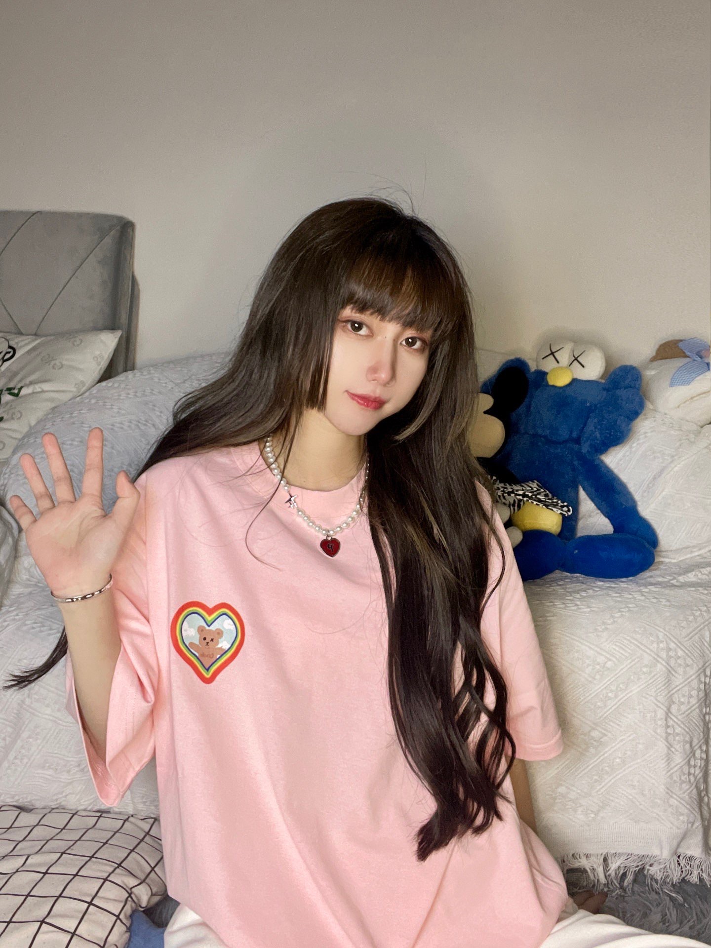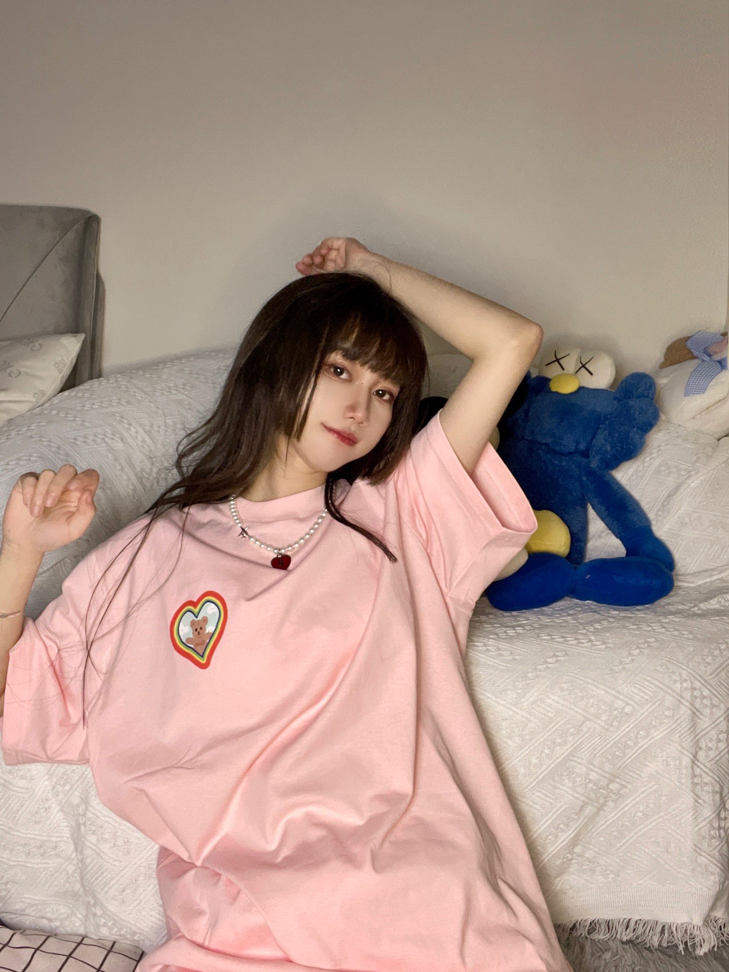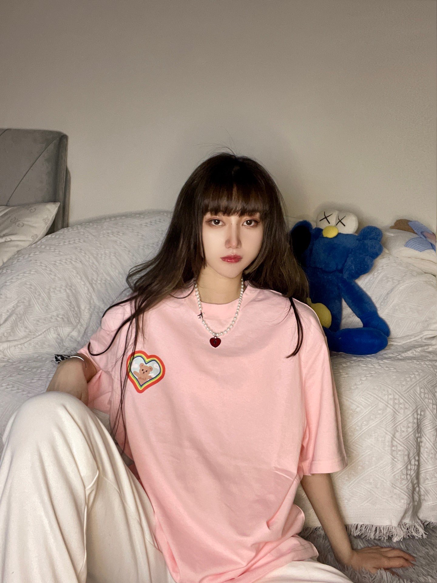 简约基本款的纯色T恤,胸前彩虹爱心小熊印花设计,增添设计层次感,宽松的版型 不挑身材,面料柔软亲肤,吸汗透气。