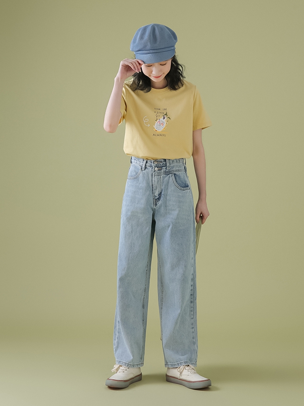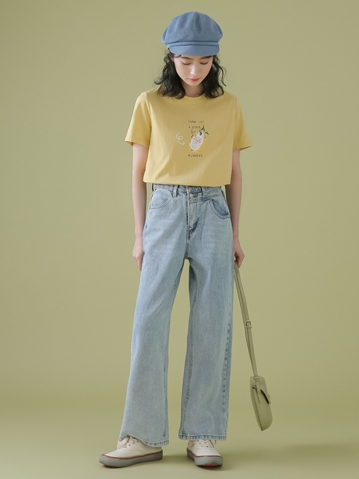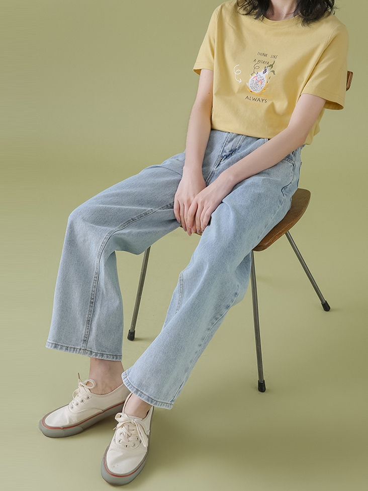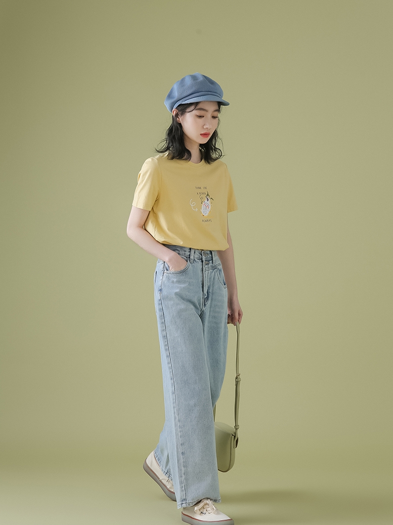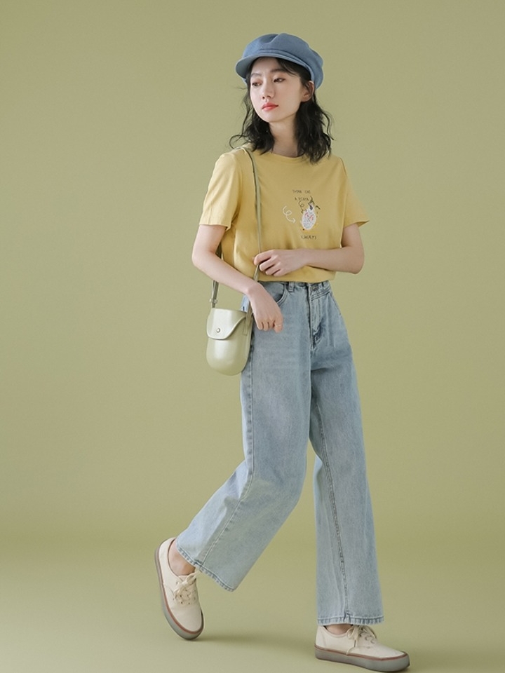 裤子的版型属于直筒版型,可以很好的遮盖腿部线条的不足。选用高腰的设计,能够拉长腿部线条。蓝色的色调始终经典而隽永,整体看起来非常的简约时尚。