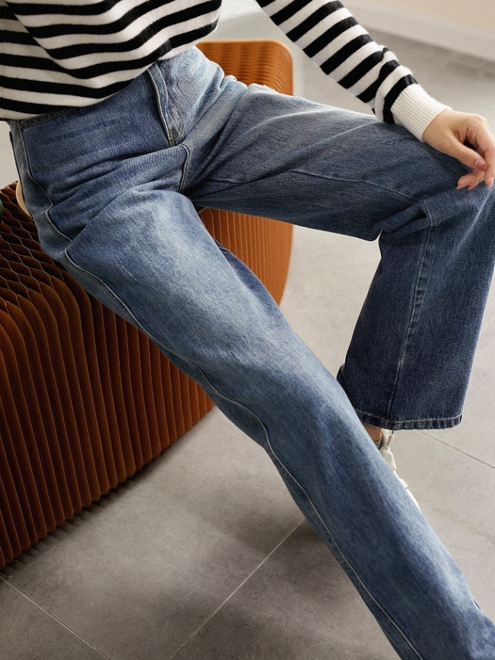 高腰设计,拉长身材比例。高腰牛仔裤,显瘦显腿长。直筒裤型,修饰腿部线条。