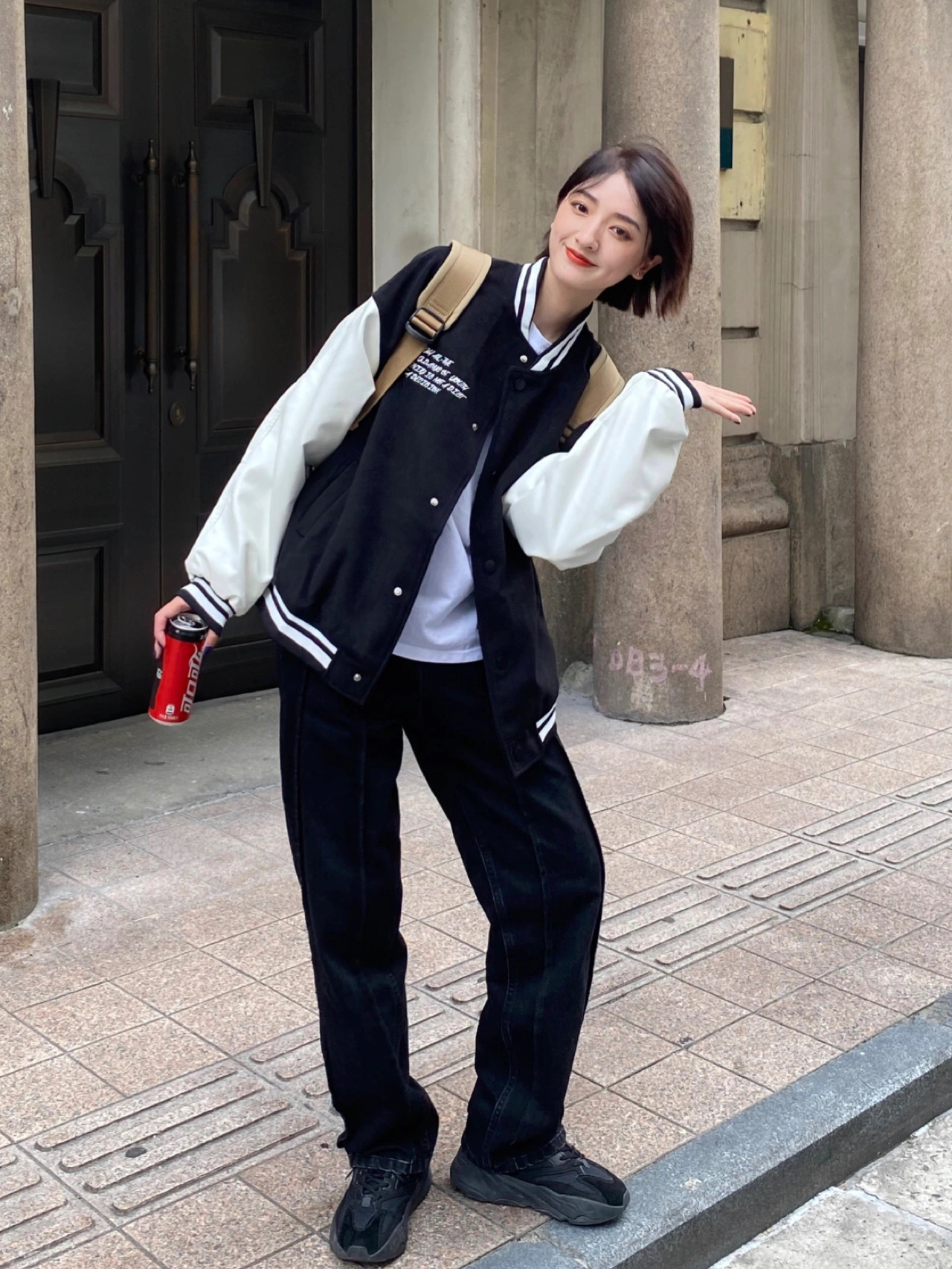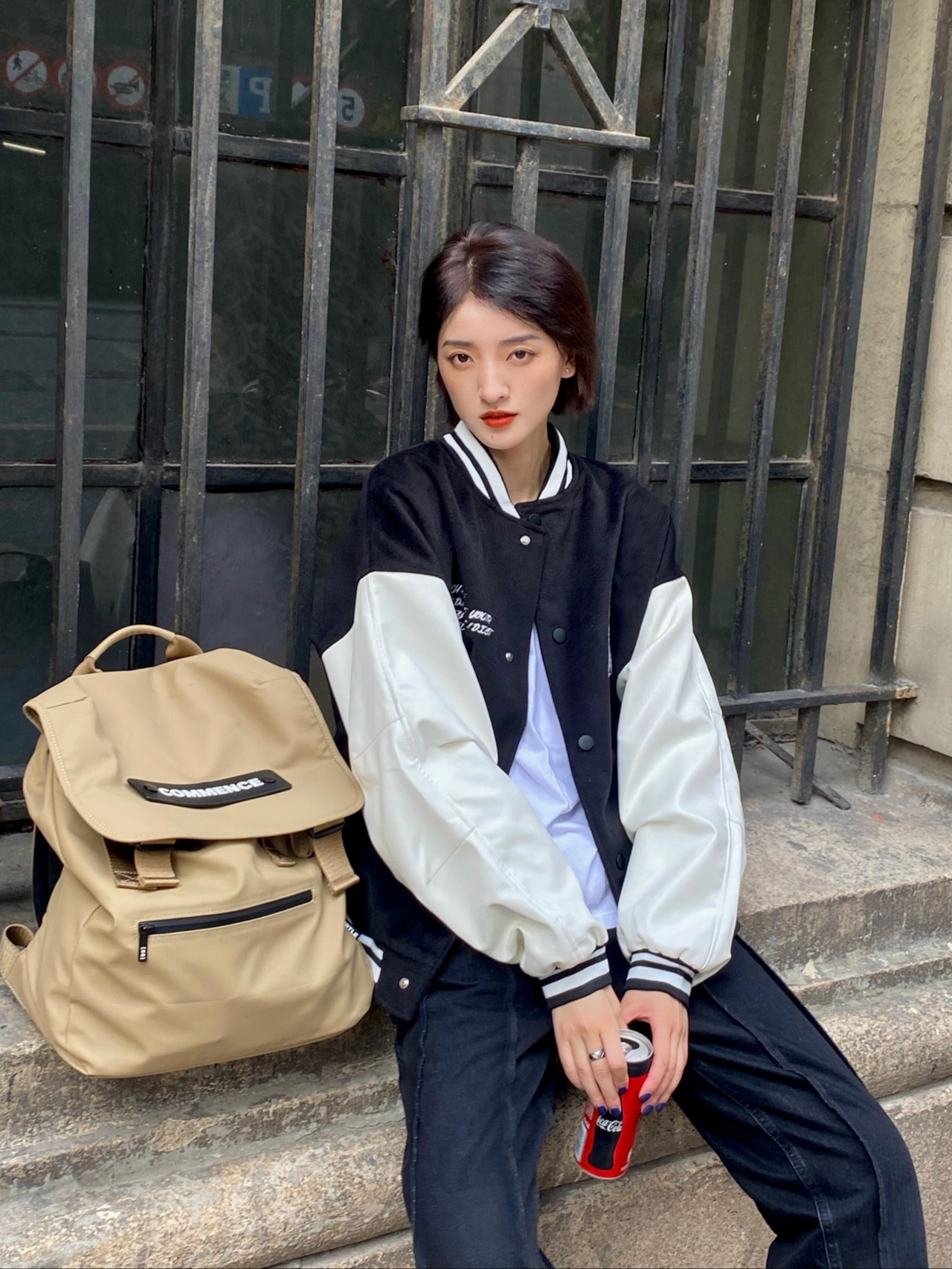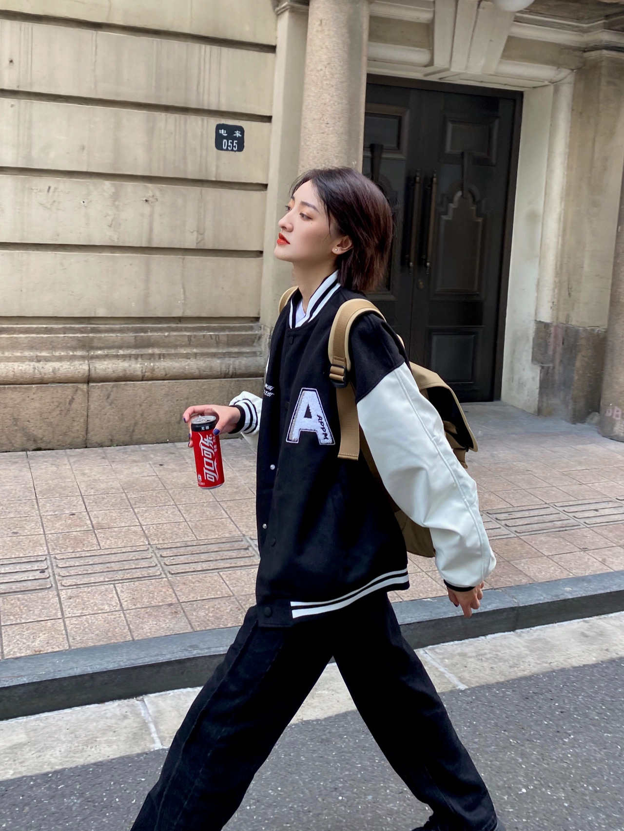 如天空般蓝色的颜色与袖口纯色面料相拼接的棒球夹克,搭配牛仔裤与休闲鞋,将街头风展现的淋漓尽致,既充满活力又前卫时髦。