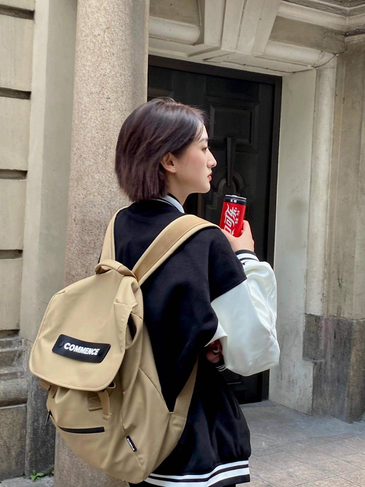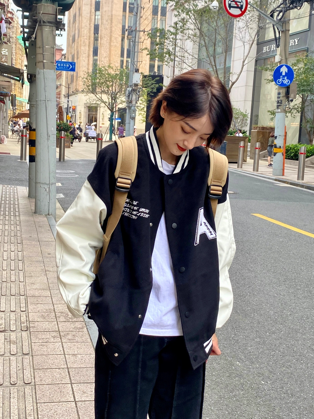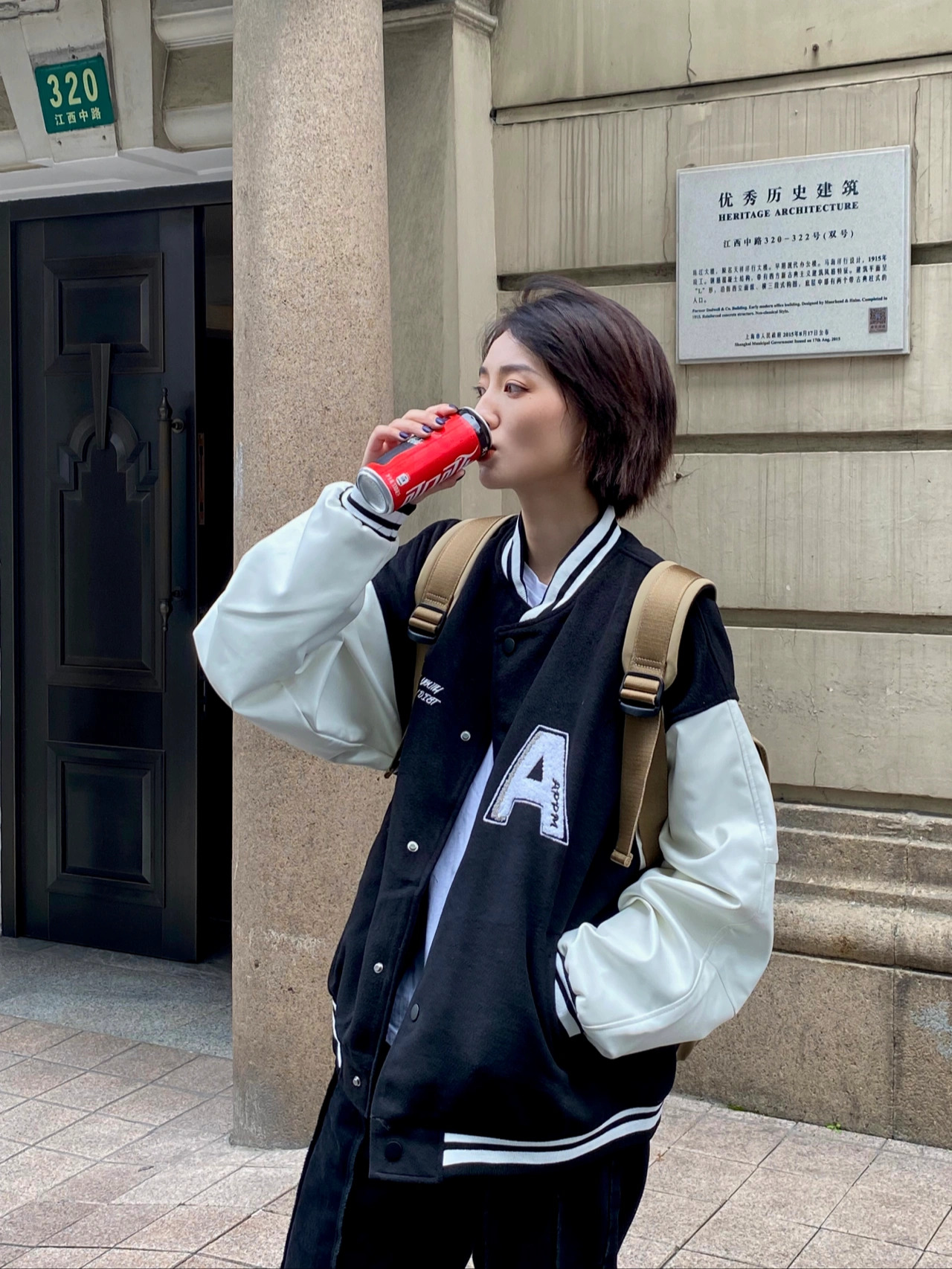 如天空般蓝色的颜色与袖口纯色面料相拼接的棒球夹克,搭配牛仔裤与休闲鞋,将街头风展现的淋漓尽致,既充满活力又前卫时髦。
