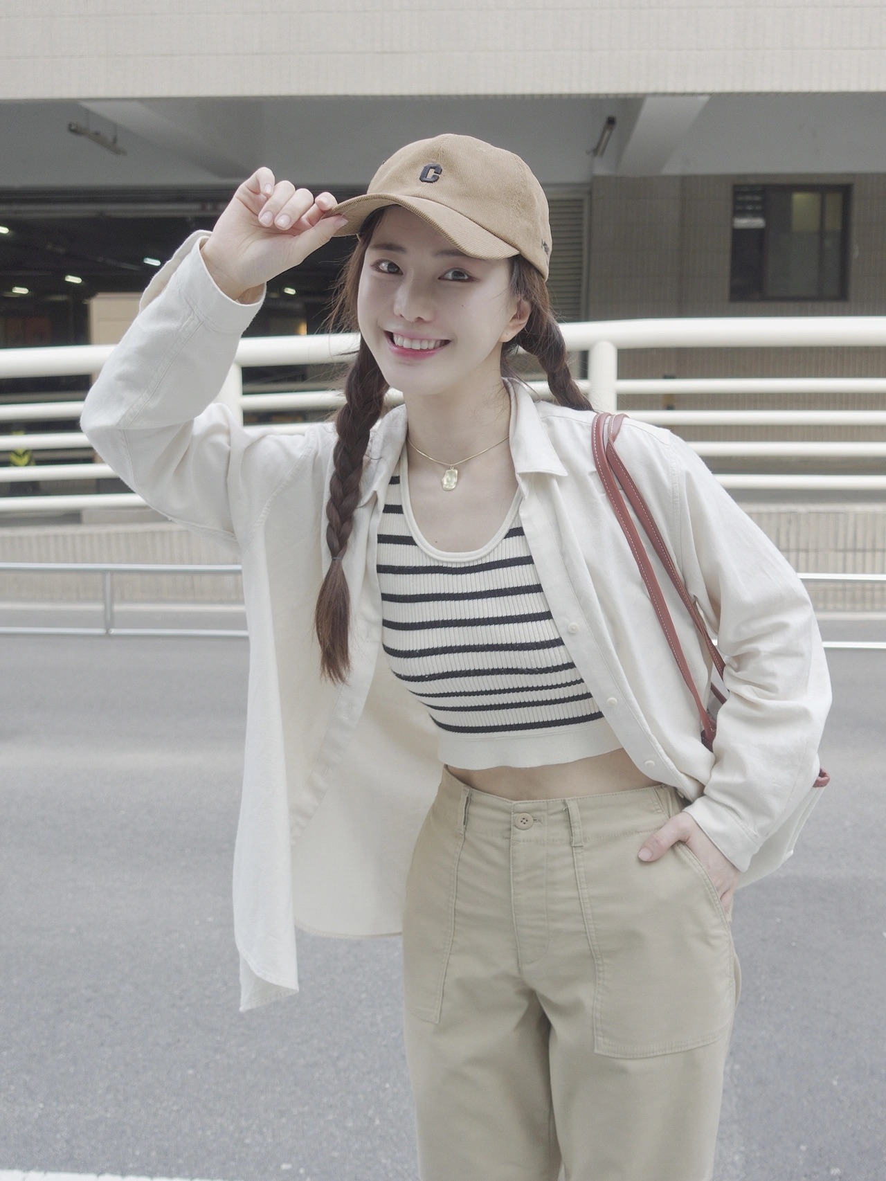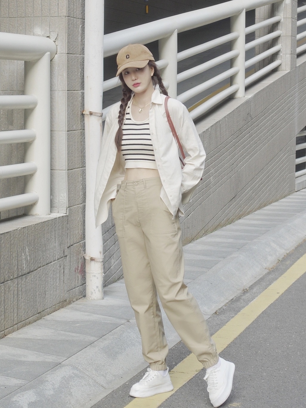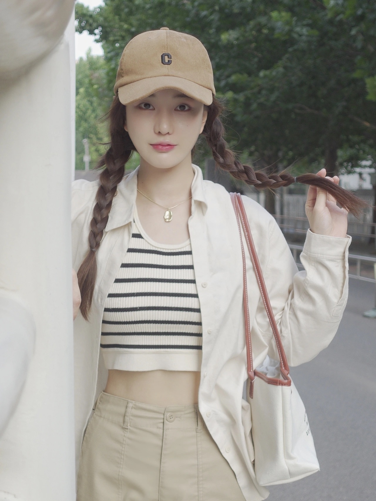 这身搭配就是暖色系 条纹背心突出整体搭配的重点,看起来简约又很有活力 妥妥的韩国女生,搭配一顶同色系的棒球帽????活力无限~