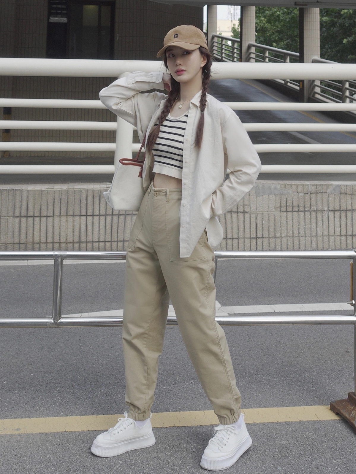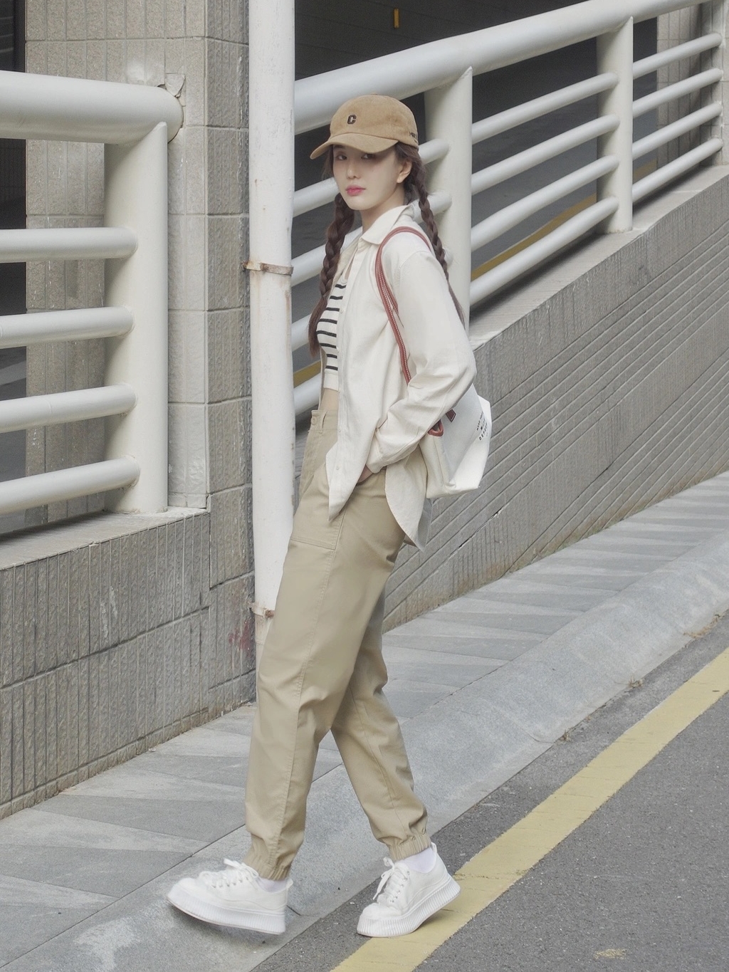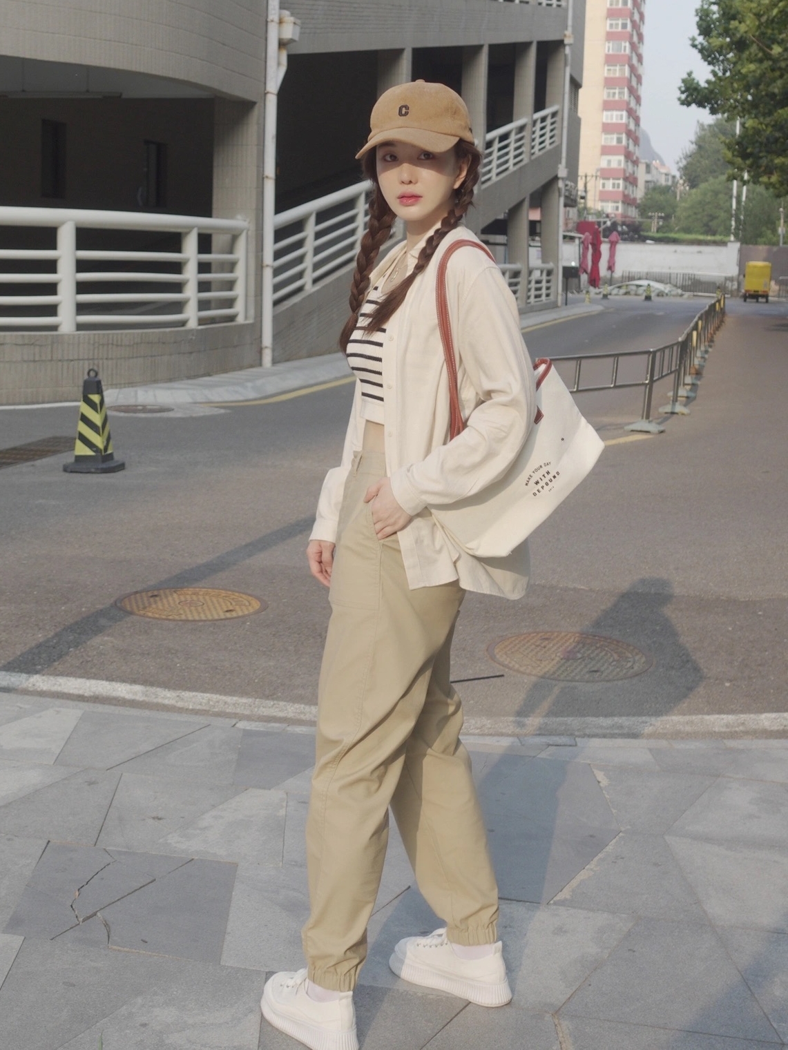 这身搭配就是暖色系 条纹背心突出整体搭配的重点,看起来简约又很有活力 妥妥的韩国女生,搭配一顶同色系的棒球帽????活力无限~
