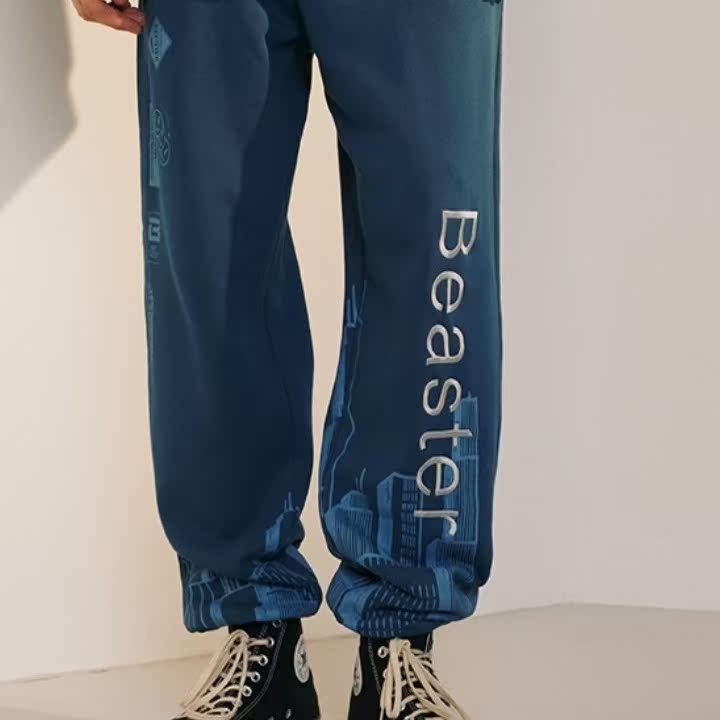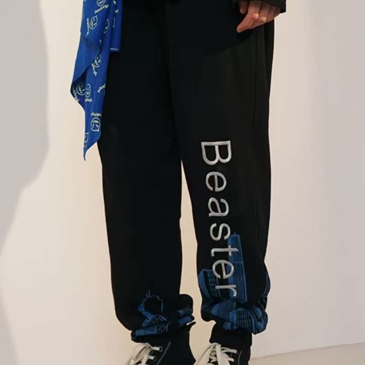 一款极简设计的运动休闲裤,舒适面料,抽绳松紧腰设计,穿脱方便,搭配简单的字母刺绣,时尚运动感满满的。