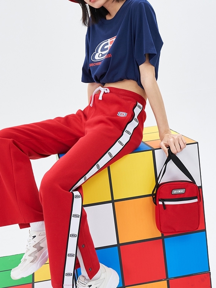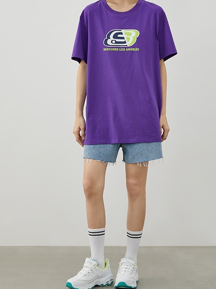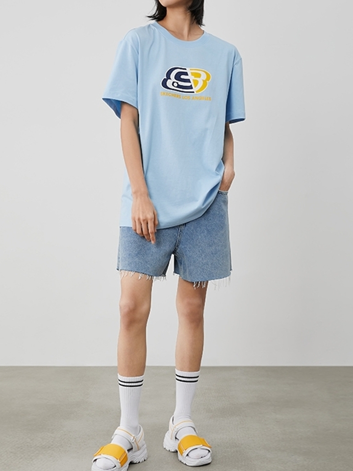 经典圆领设计,修饰颈部线条。时尚的LOGO字母印花,红黄蓝的经典配色,展现街头潮流文化,视觉主题明确,和服装底色形成撞色的效果。
