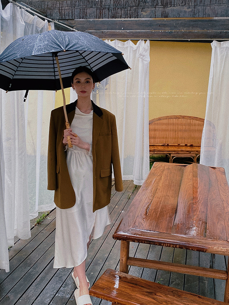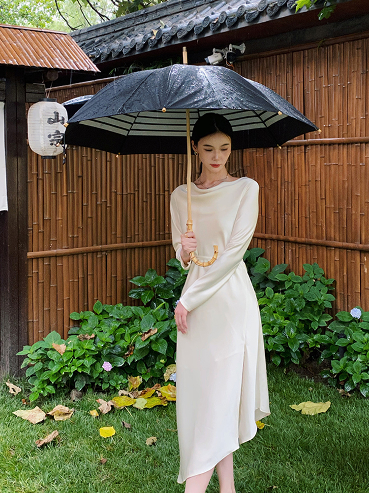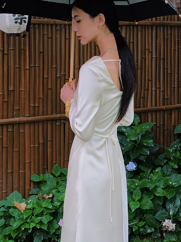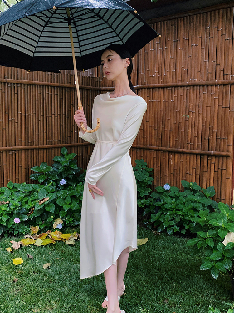 飘逸裙摆下若隐若现的双腿平添性感气息.让素雅的珠光白也能拥有WU限美好的风景.长袖设计温婉不俗,高J美感不声张.不露声色留出遐想空间.白色本身就是气质清冷,是映照在心头的白月光~