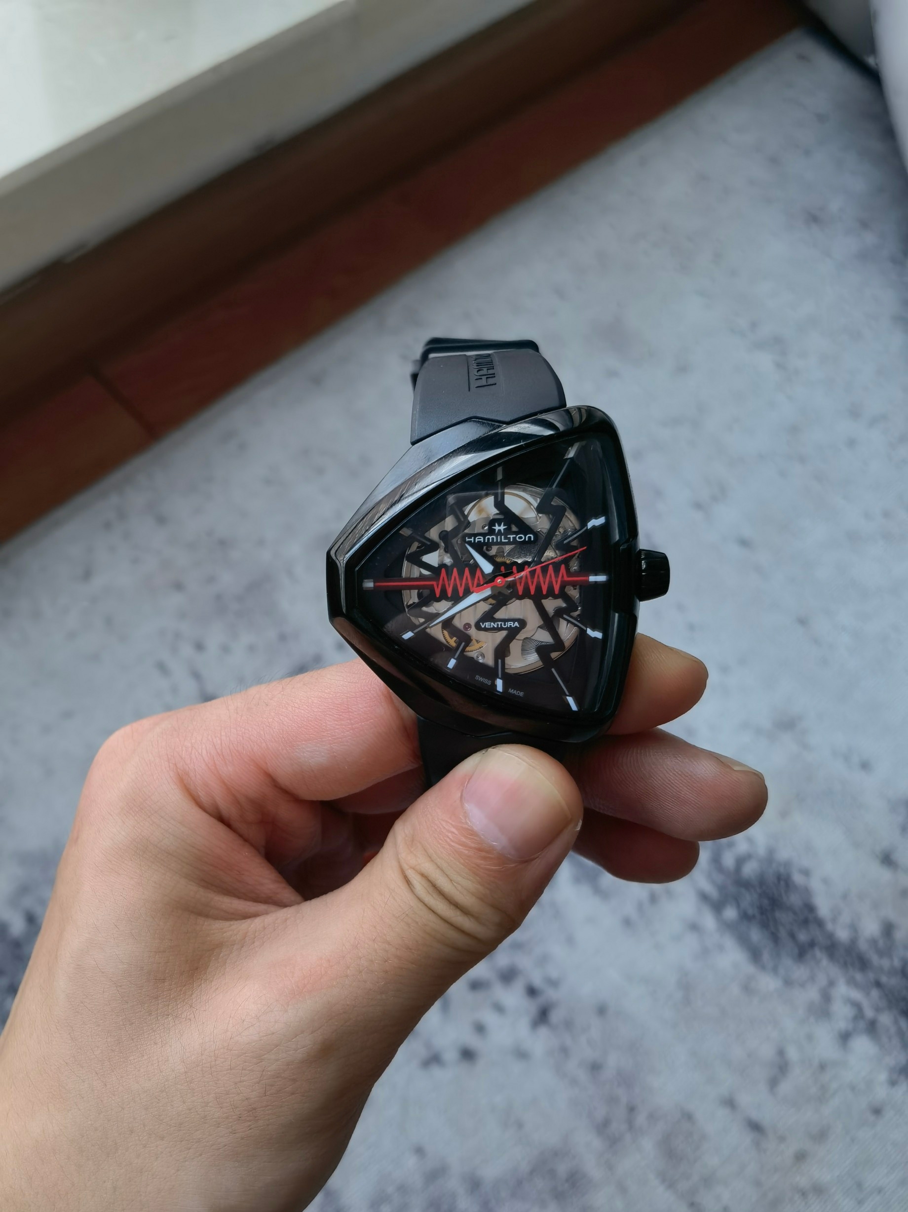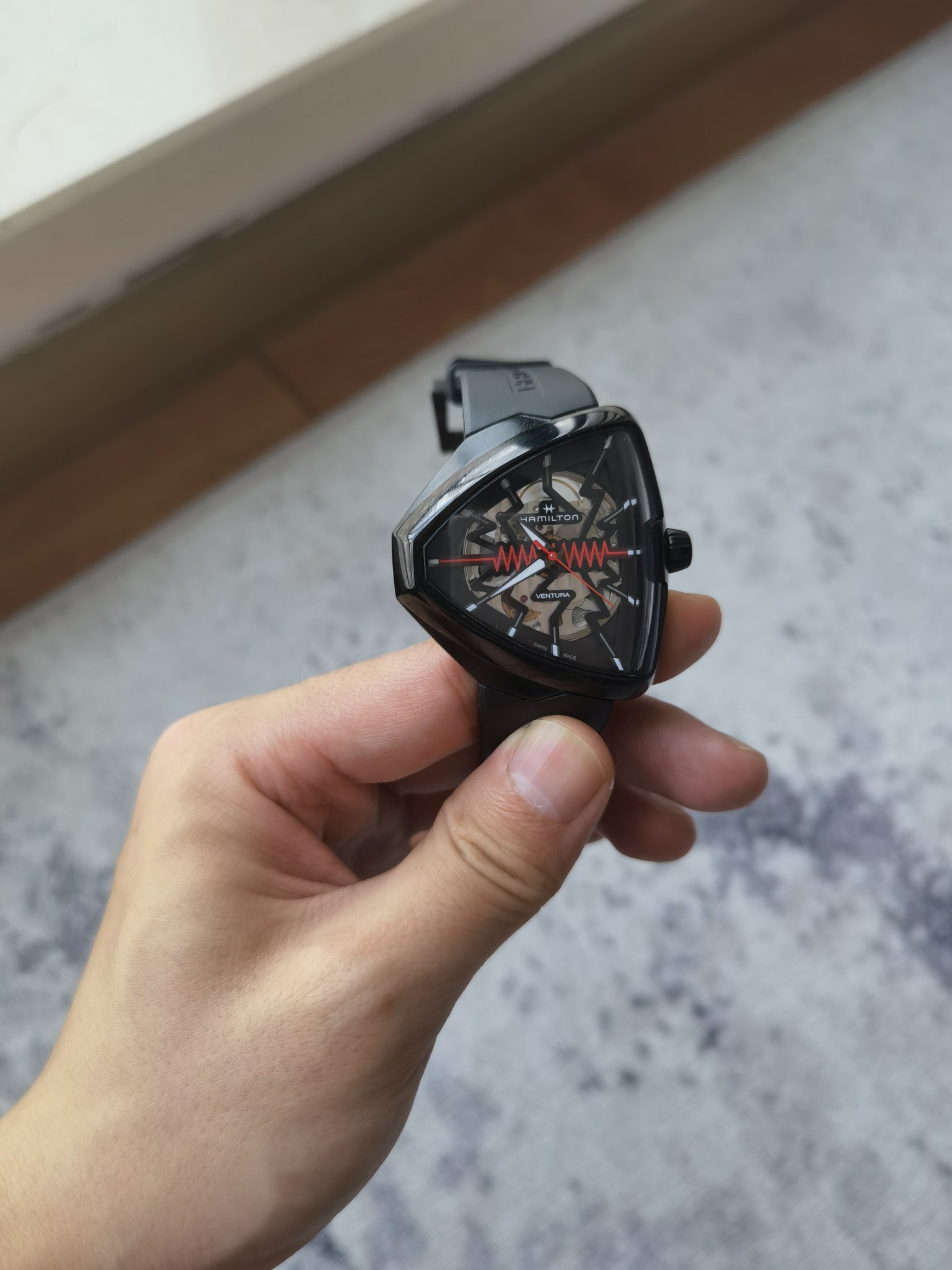非常喜欢并且颜值也超高的一款汉米手表,表盘很厚实大小适中,立体三角形表壳是猫王系列独特的设计,外形炫酷,回头率超高,带上去很有感觉。