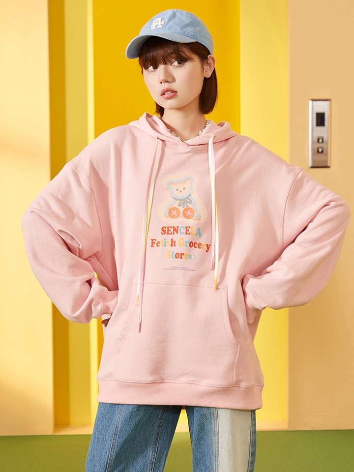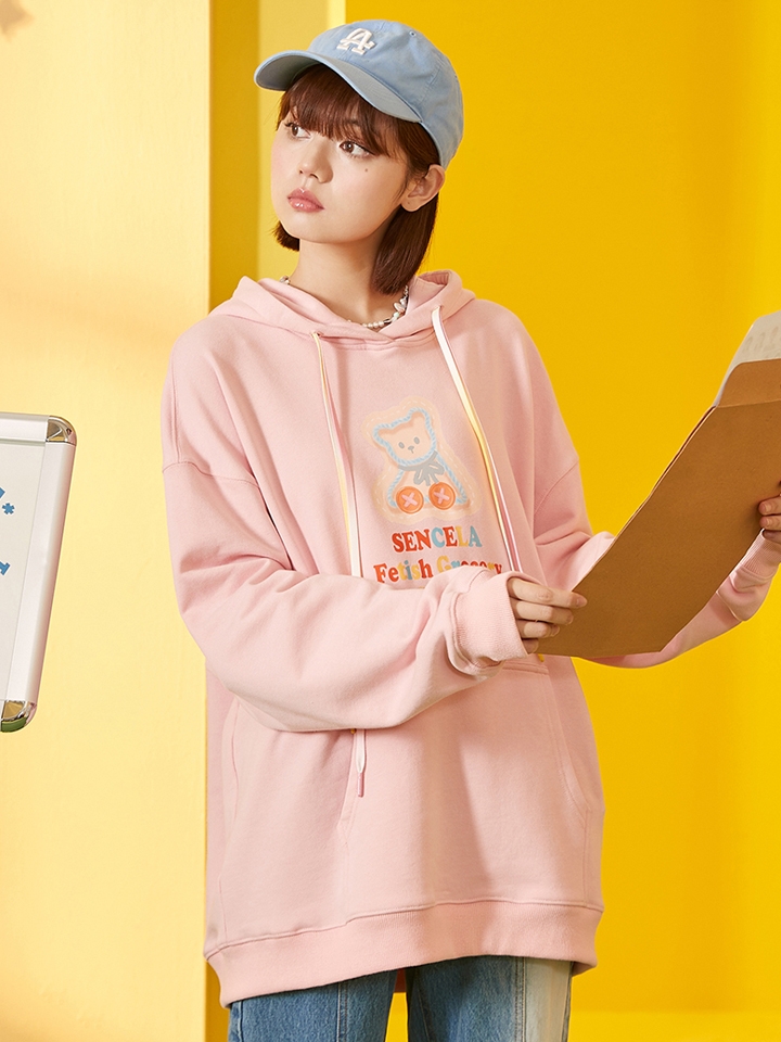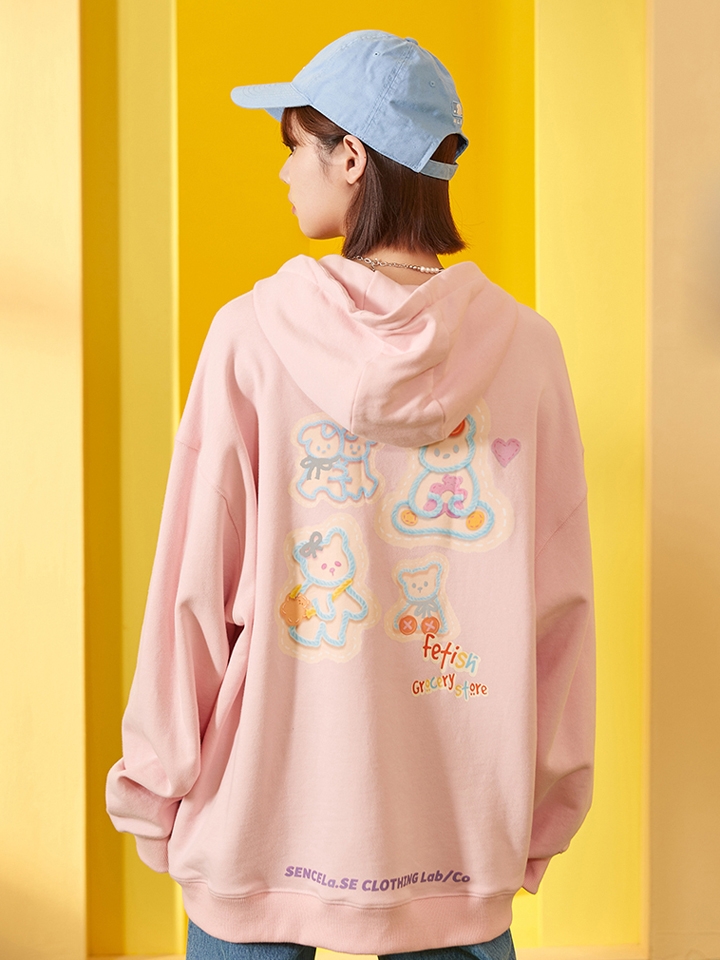 落肩款式的卫衣是现在基础款的流行趋势,颜色都很清新,胸前是可爱搞怪的小熊图案,后背就巧妙的设计了背影图案,这种巧妙的呼应感显得很妙趣,搭配起来给人一种清爽而新颖的视觉