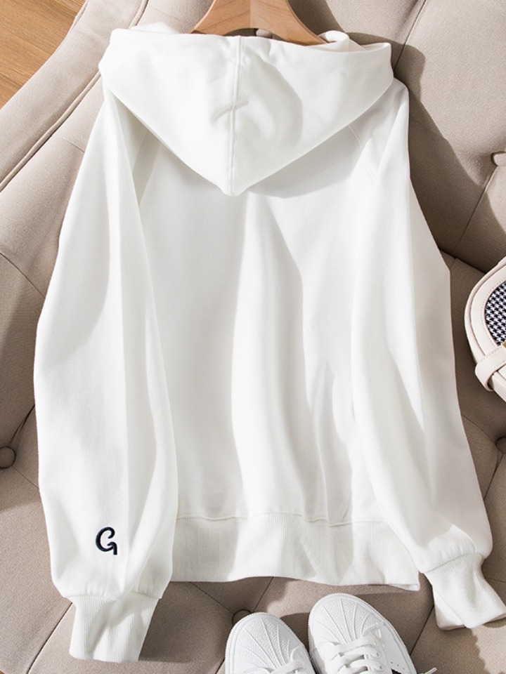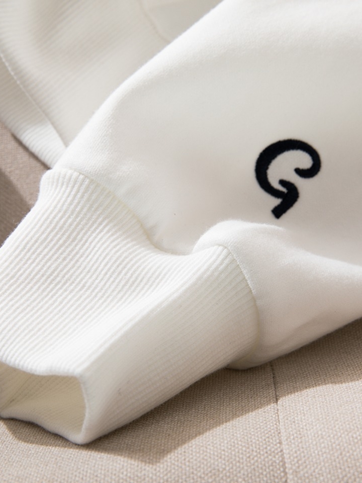 简单的白色连帽卫衣,口袋为袋鼠袋,宽大舒适,置物力超强,面料采用精梳棉,前幅弧形布兜设计,温暖呵护宝宝小手,还可以放置宝宝的随身小物件唷!