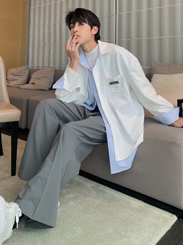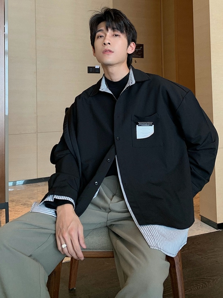 选用优质条纹棉质面料,手感柔软穿着舒适透气,十分简约。胸前的大小口袋,不光立体感十足,形成了有对比的视觉差。经典的翻领,有效修饰脸部线条。下摆侧边的开口补丁设计,体现出用心的细节。