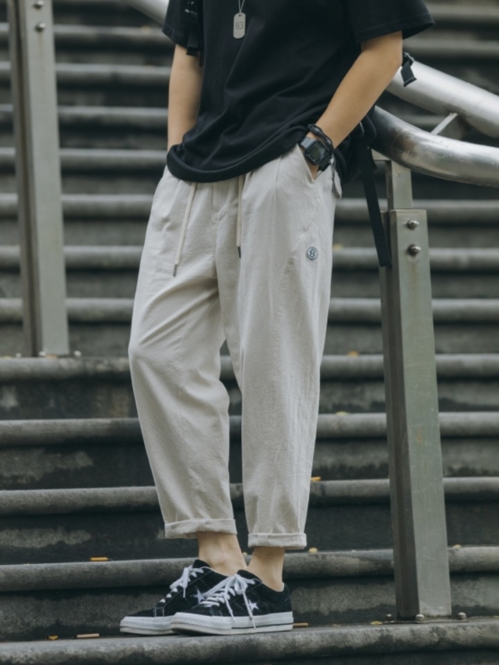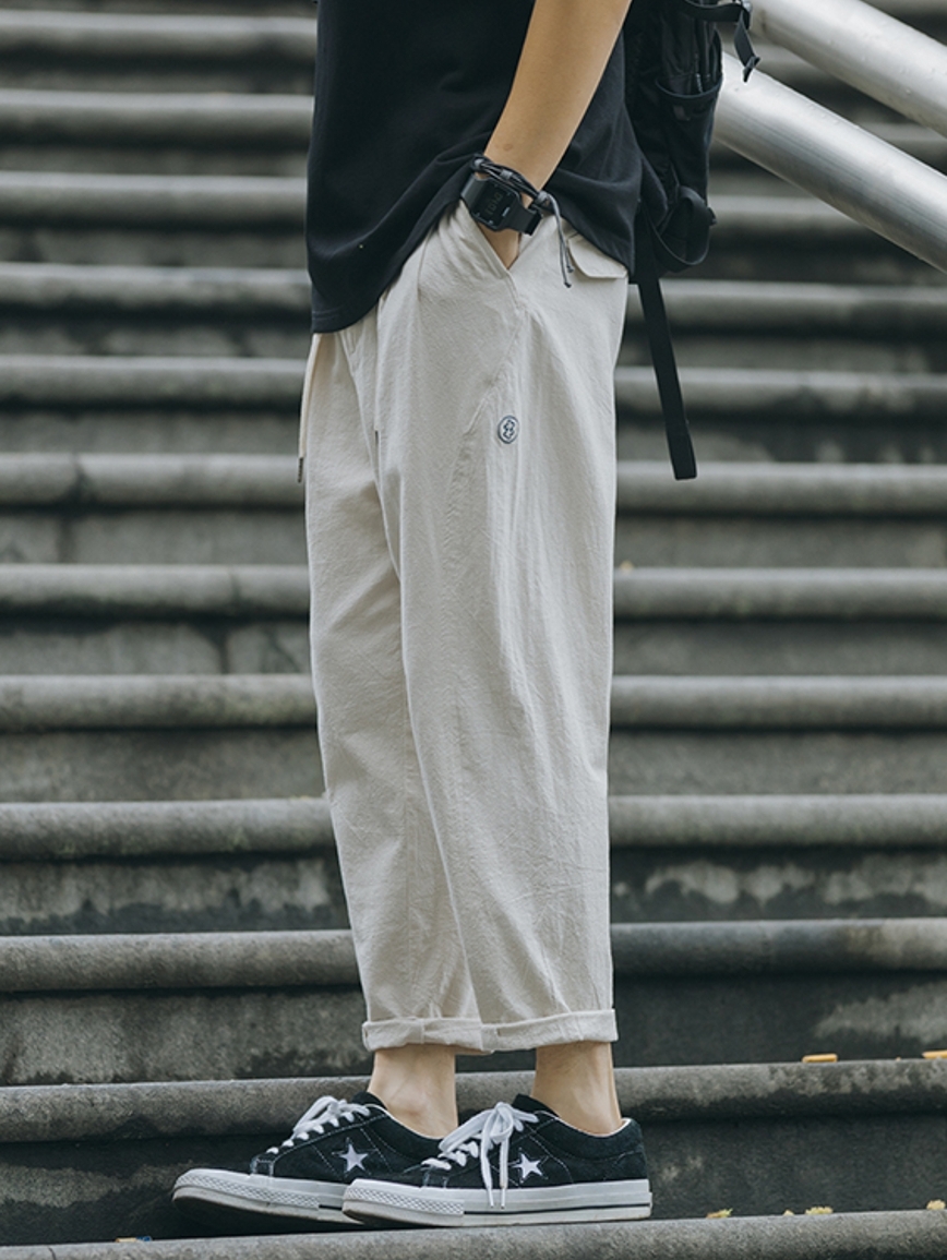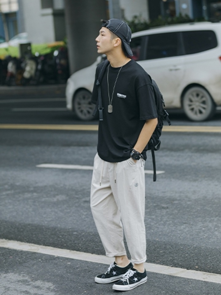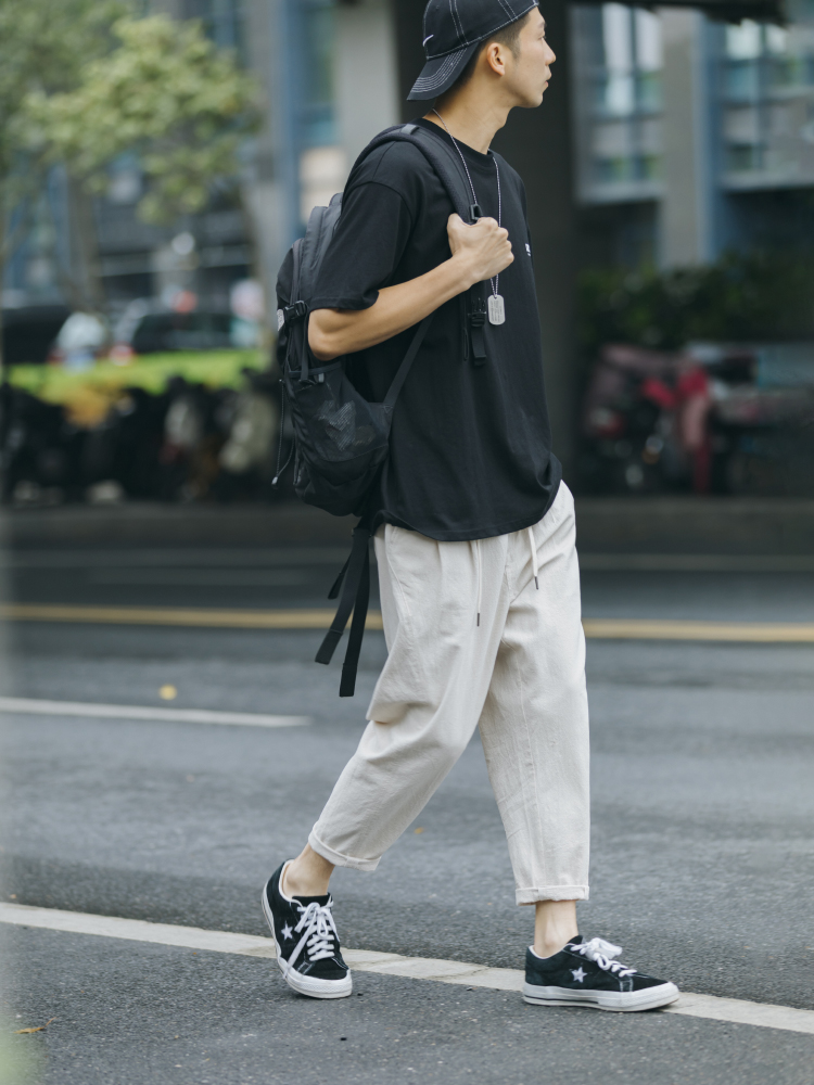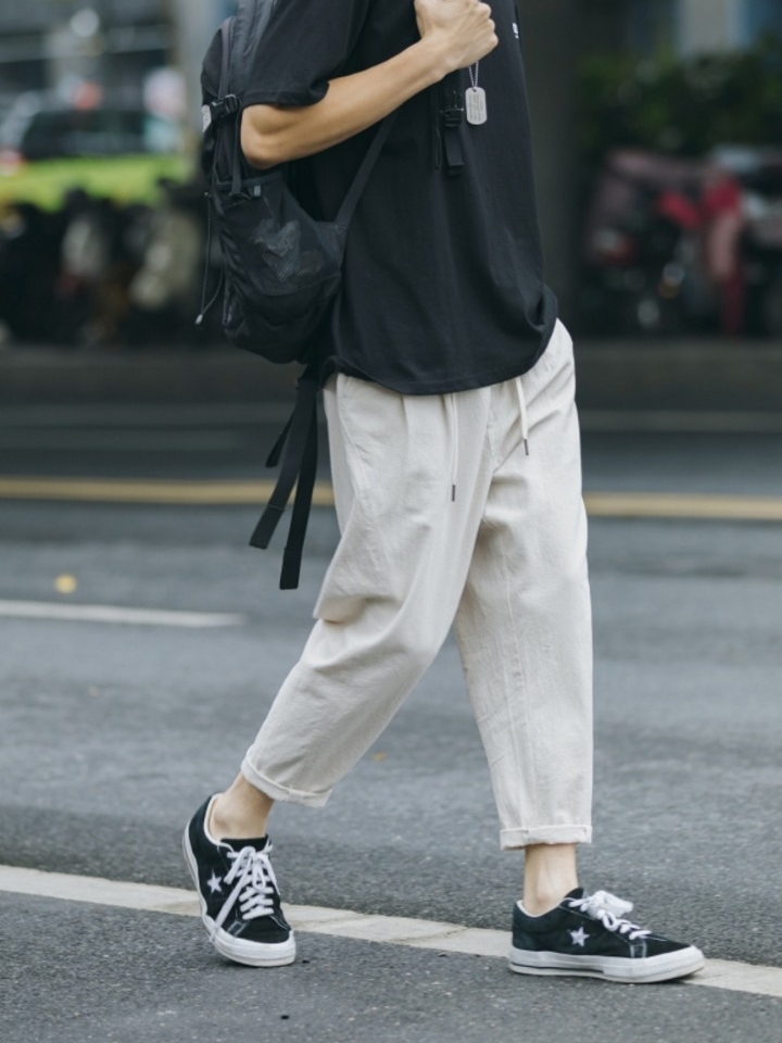 哈伦休闲裤的面料选用的是高含量棉料与少量聚酯纤维的混纺材质,既融合了棉料吸湿、保湿、耐热、耐碱且弹性高等优点,又有聚酯纤维良好的抗皱性和保形性,较高的强度能使面料抗皱免烫,增加其坚牢耐用的性能。
