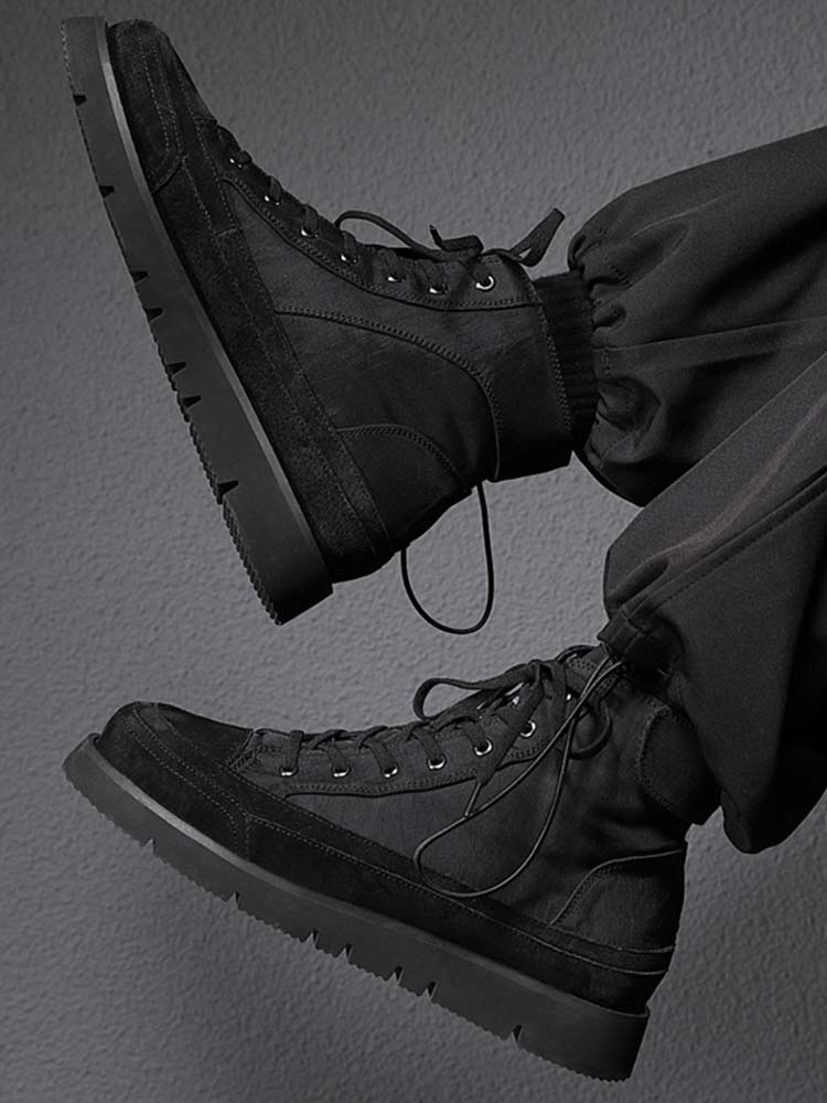 休闲复古风格的短靴,建议搭配整体以复古风为主,这样才有biger。上身同样采用了白T恤加夹克的叠穿模式,营造出立体层次感。下身一条复古丹宁裤,在搭配时卷起裤脚至这双短靴鞋口上方3cm处最佳。整体配色不会太跳脱也不会过于沉闷,带着一股男人的硬汉气质。