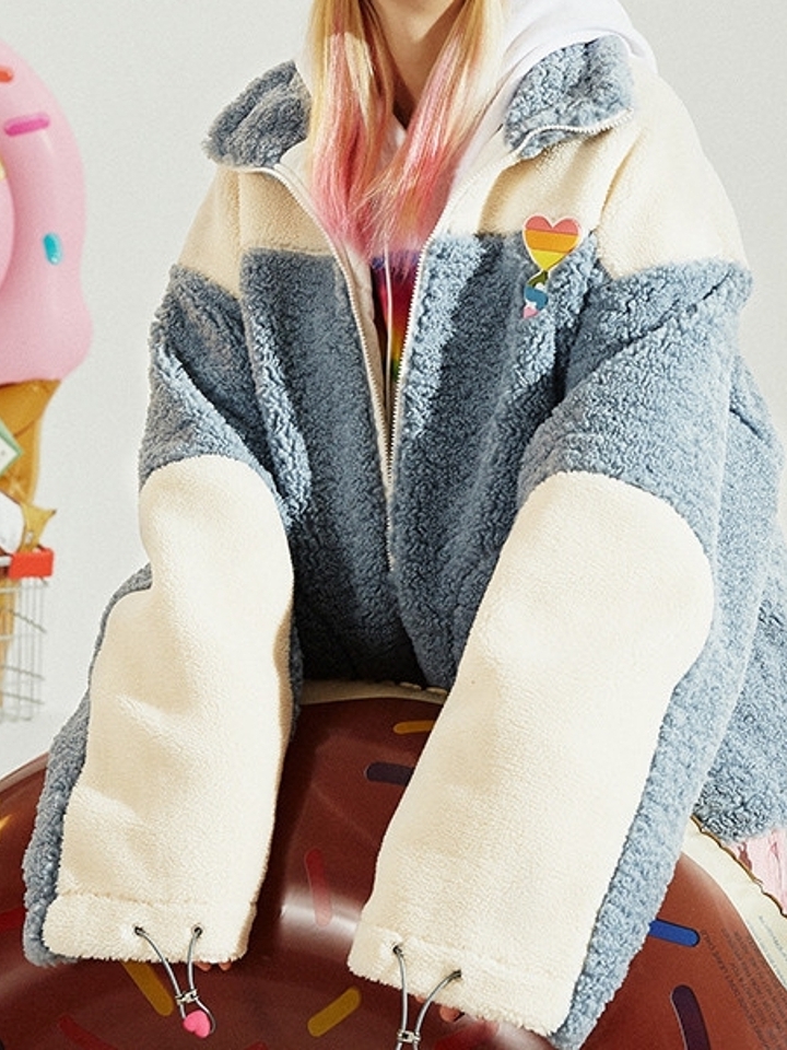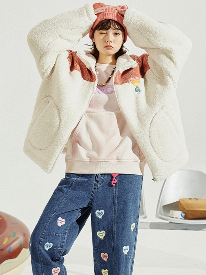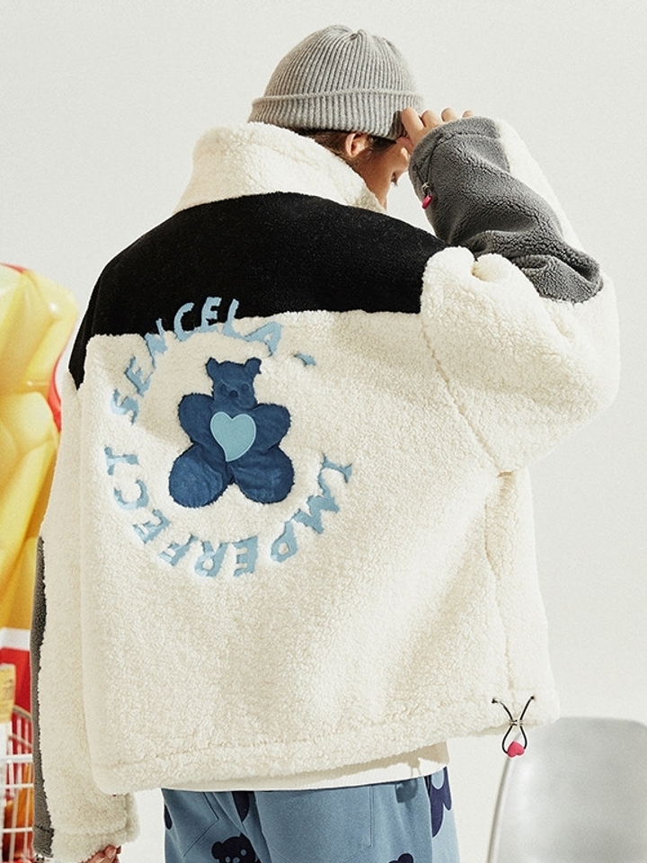 温暖舒适的羊羔毛时尚又温暖,配上背部小熊印花刺绣更显可爱。纯羊羔毛立领设计保护颈部不受寒风侵袭,Oversize的版型穿着舒适不受约束。