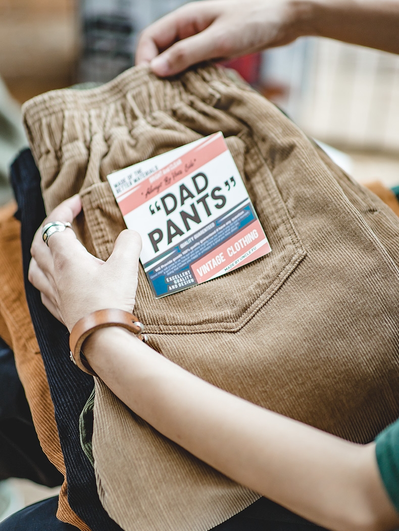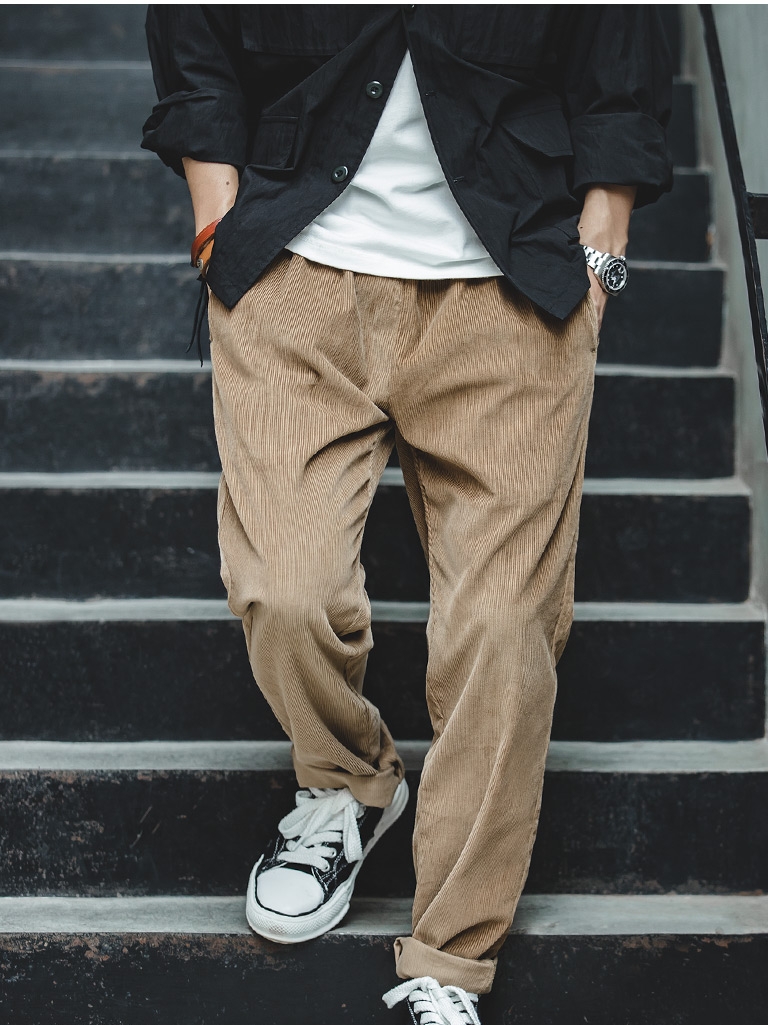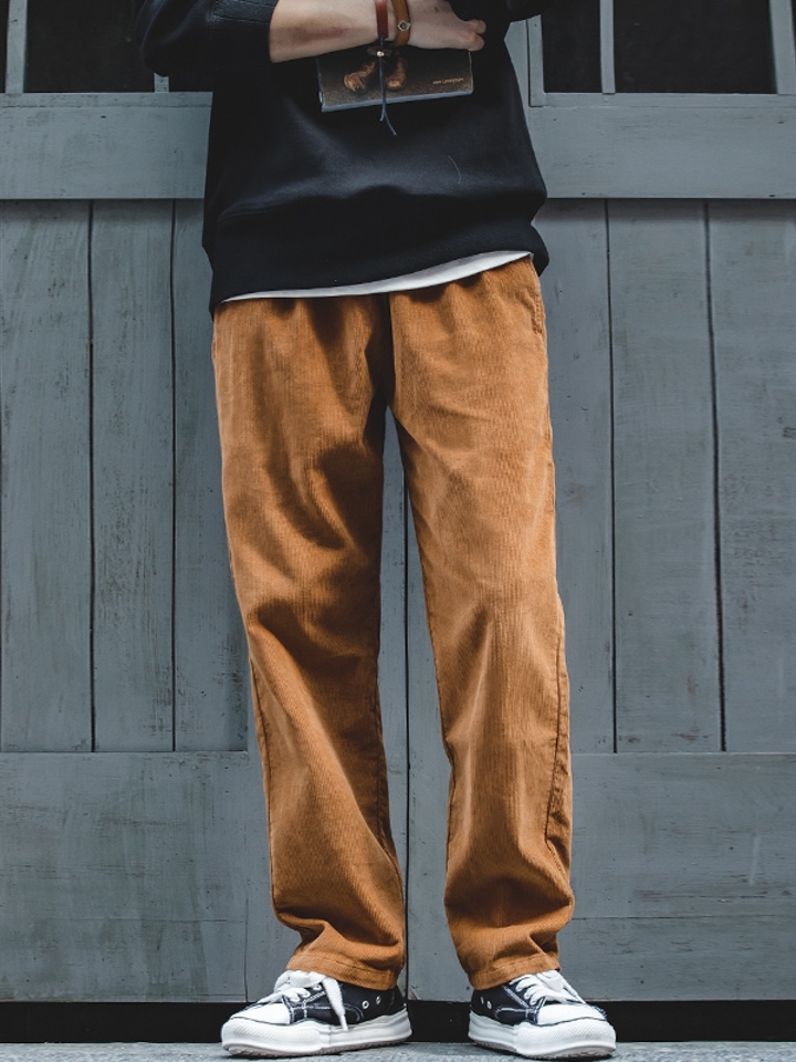 宽松直筒长裤,厚实柔软的棉质灯芯绒面料搭配复古优雅的酒红色,光泽感和垂顺度好,上身很有韵味,阔腿的设计很好的遮肉显瘦,全松紧的弹力腰部穿脱方便,侧边隐形插兜实用美观。