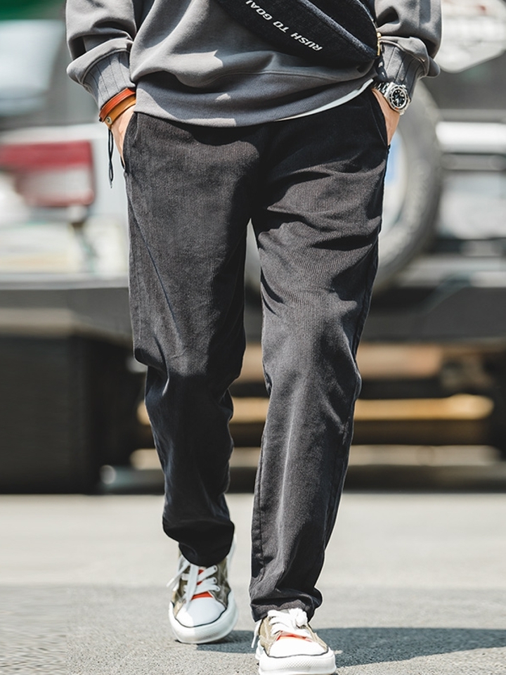 灯芯绒面料制作的这款休闲裤,表面是有着肌理感,看上去的时候非常有质感;松紧的腰头造型,搭配上宽松的廓形,不约束身材,同时穿脱方便;裤脚是可以卷起来的,显得非常自在,同时淡淡的色泽,穿在身上的时候有着复古文艺的气质。