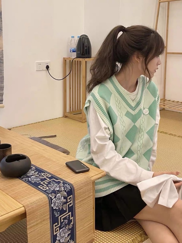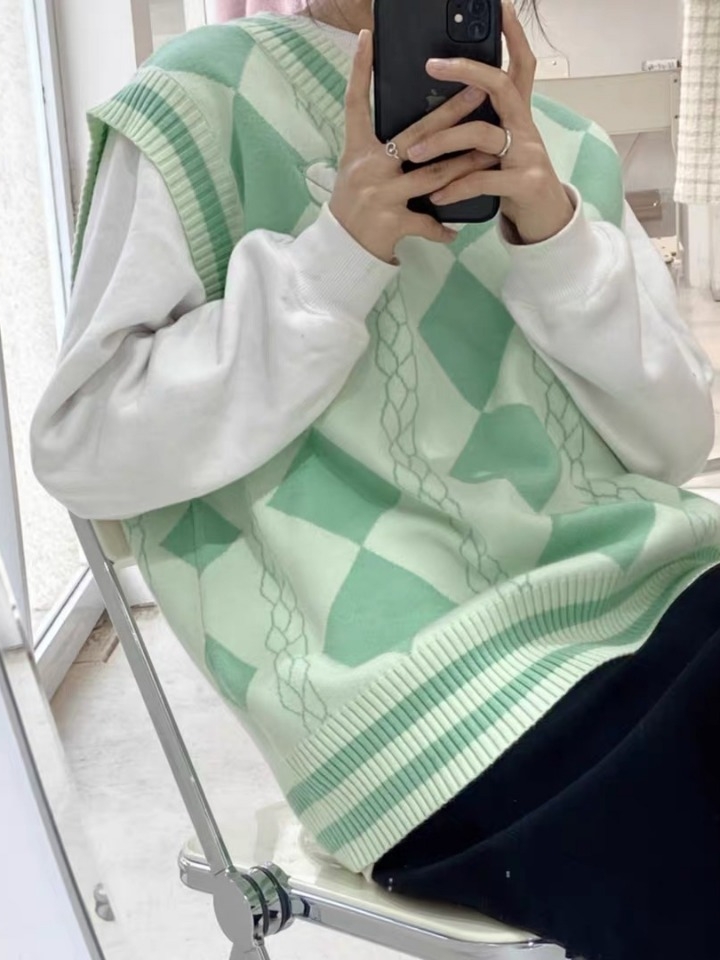 菱形格纹的图案,也是一直都很流行的系列之一,增添了几分青春气息,永不过时,V领适合大多数脸型的女生穿,非常百搭,直筒的版型也不太挑身材,冬季就穿它