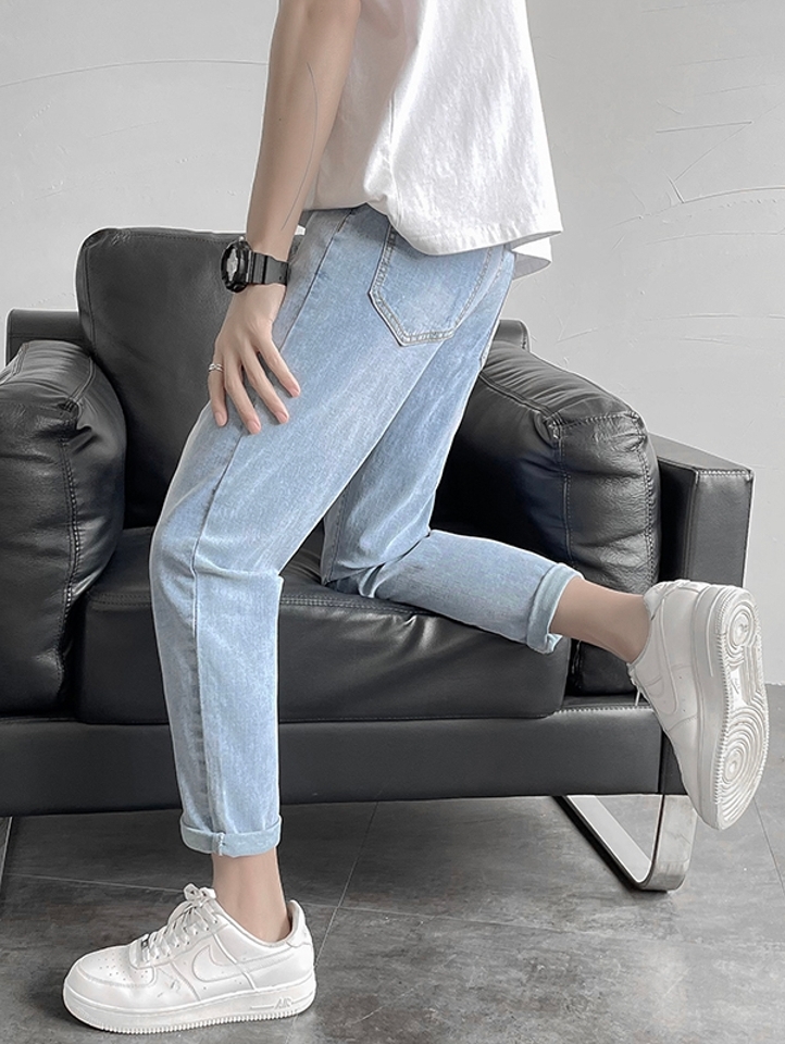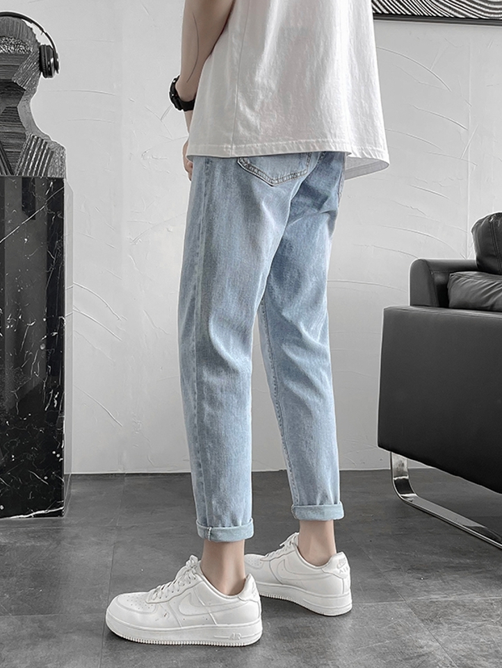 韩版宽松的裤型,清爽大气的配色,水洗磨白的处理,带来经典的视觉效果。