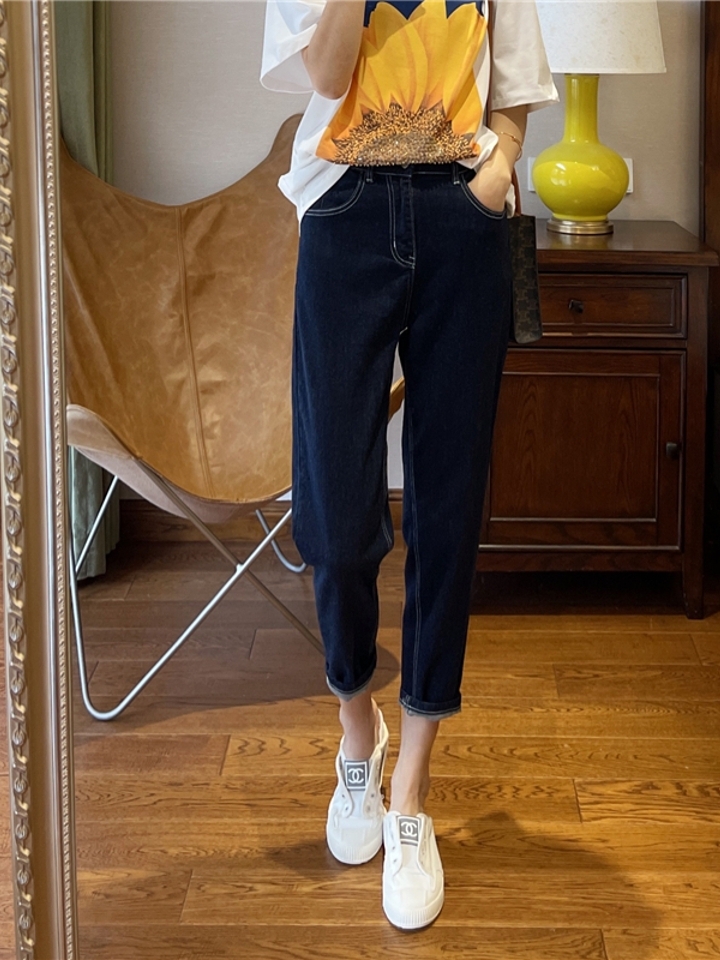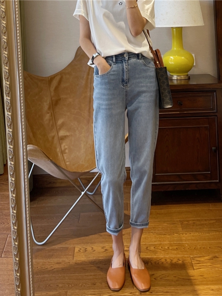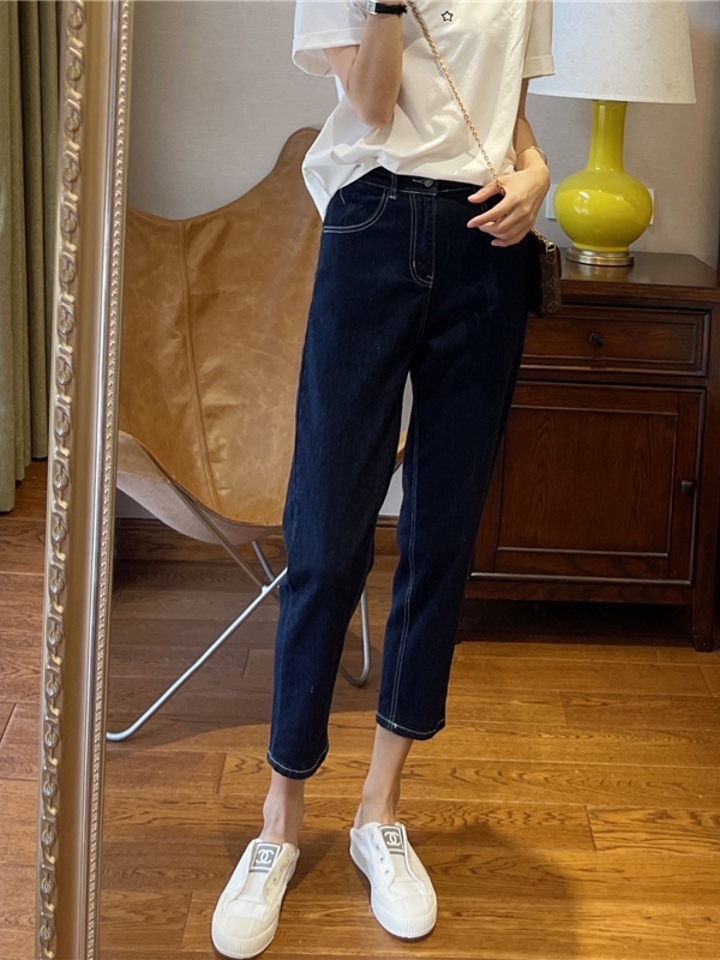 九分哈伦牛仔裤,穿上露出一截脚踝,非常显瘦显高挑,高腰的款式,非常舒适,休闲风格很百搭。纯棉面料,做工工整,面料舒适,小脚收腿的版型,卷边的效果更好看。