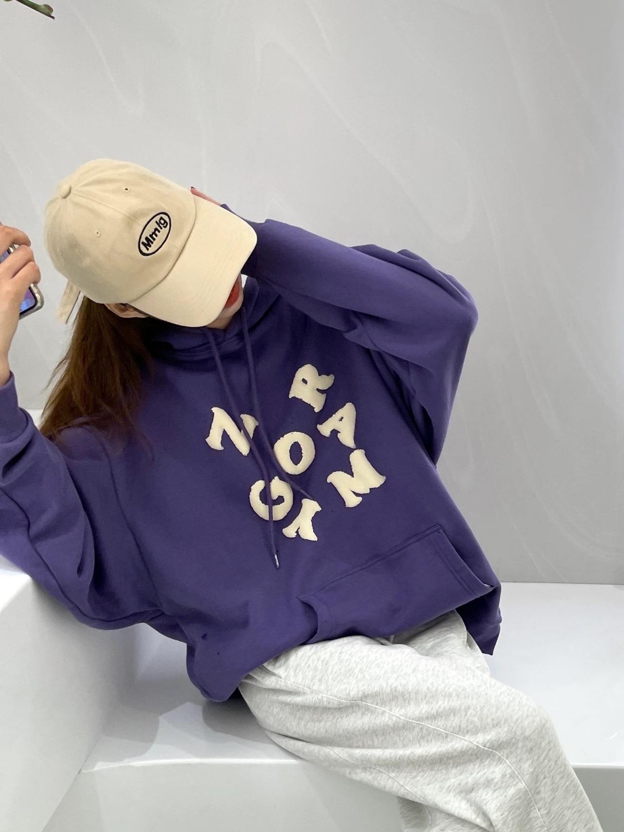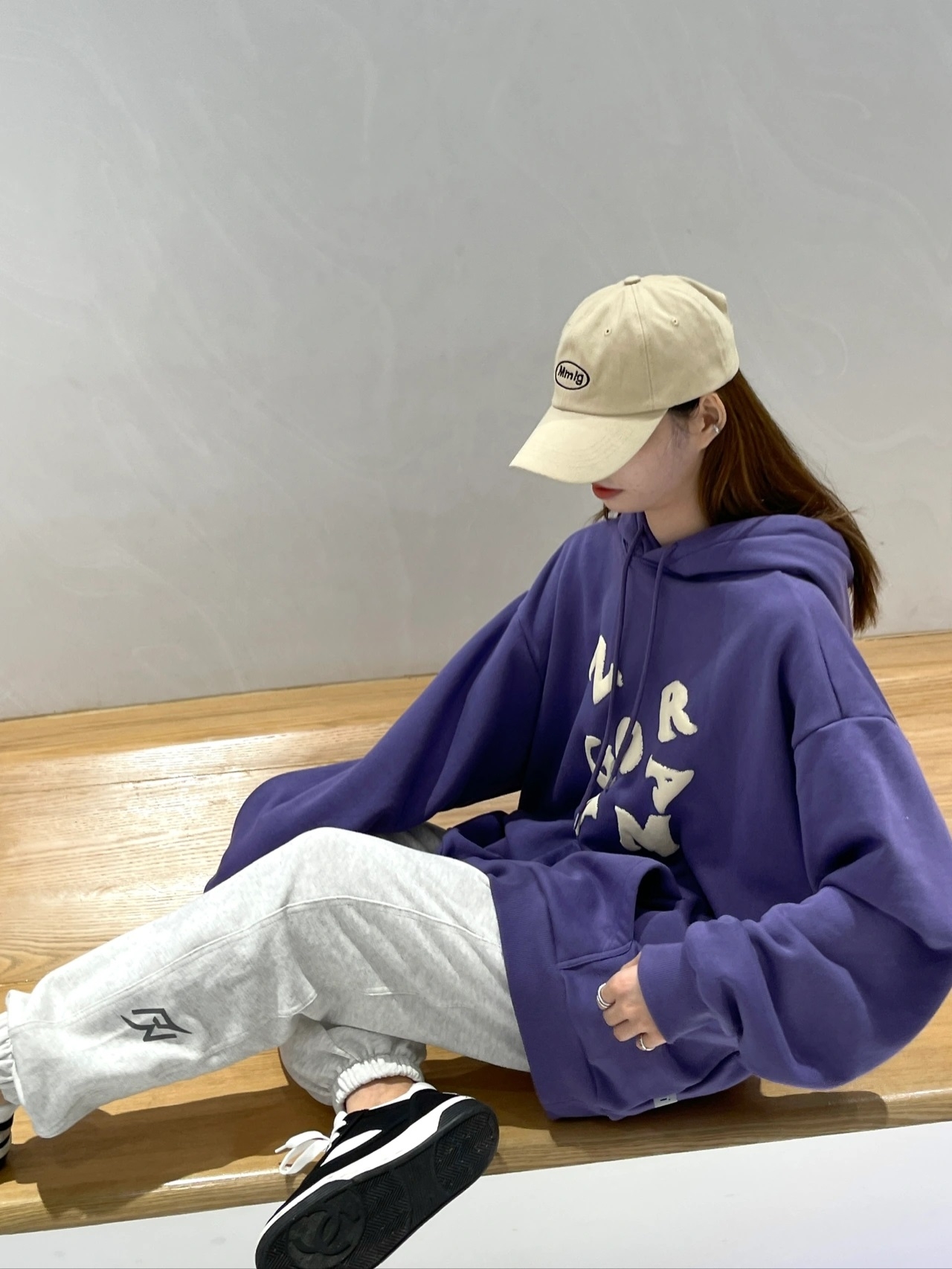 卫衣版型和厚度都刚刚好,可盐可甜,紫色显白一绝,印花很好看,颜色也是自己喜欢的。
