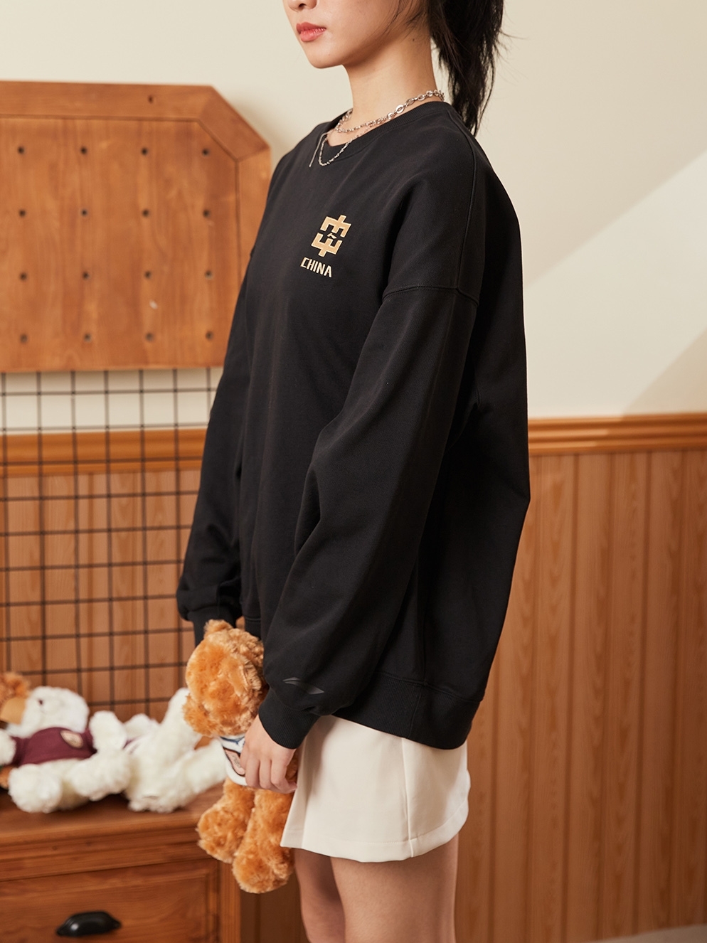 看似普通的卫衣,其实暗藏女生喜欢的小心机。首先印花的分布非常舒适,在衣袖和胸口位置相呼应,黑色衣身映衬这金色的印花,高级感立现。而且满满的中国元素,更加立体的呈现简约不简单的爱国青年气息。