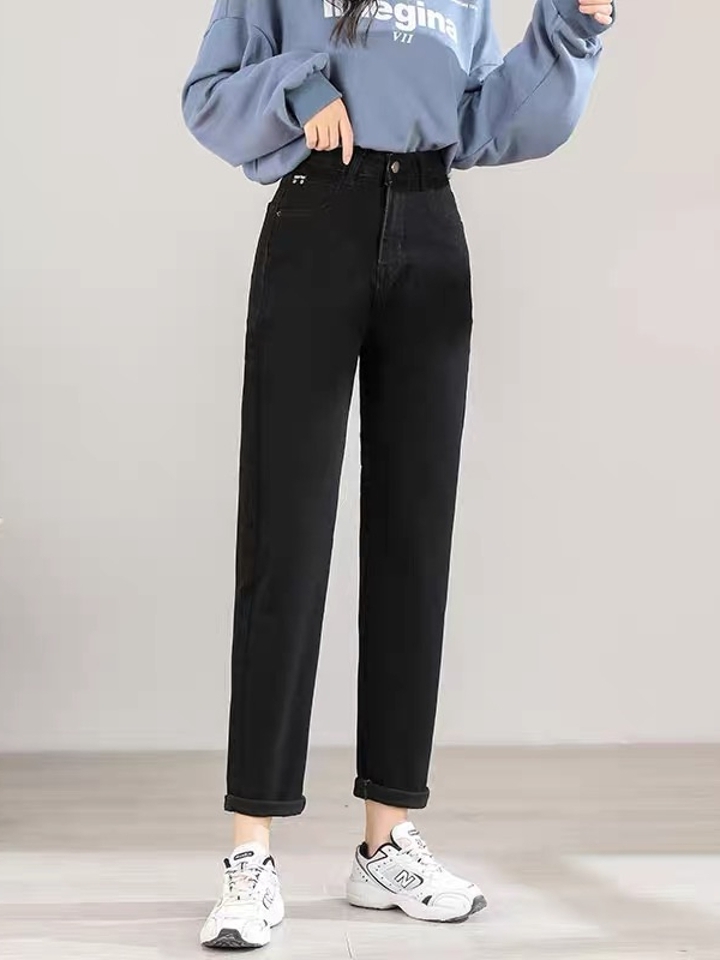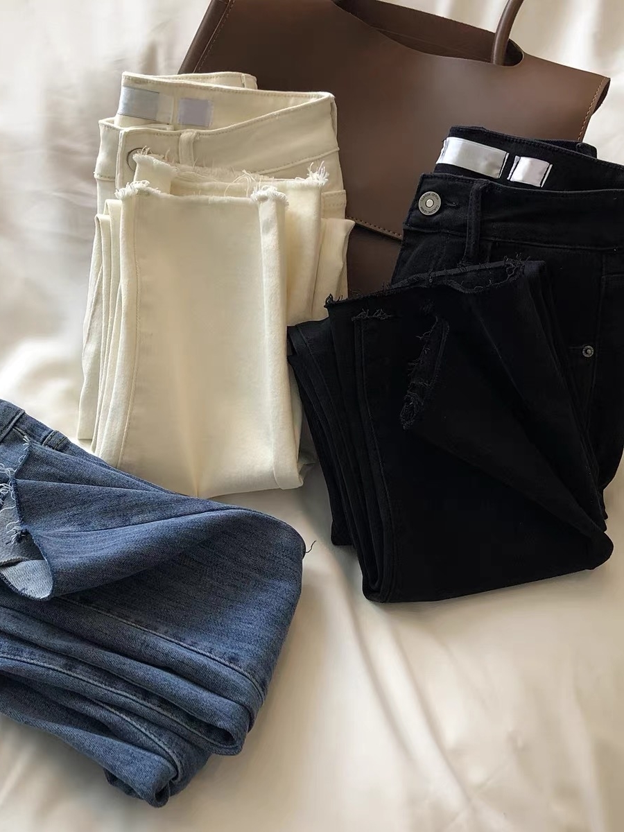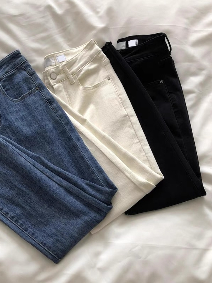 高腰设计,拉长身材比例。高腰牛仔裤,显瘦显腿长。直筒裤型,修饰腿部线条。