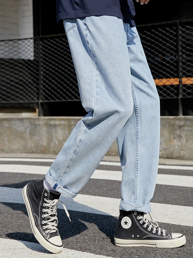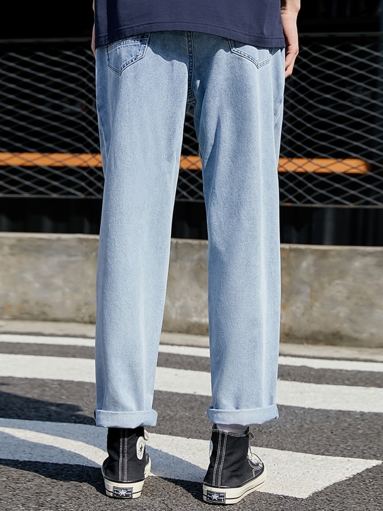 高腰设计,拉长身材比例。高腰牛仔裤,显瘦显腿长。直筒裤型,修饰腿部线条。